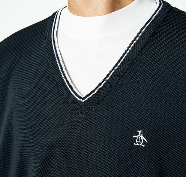 モックネックを一体化させたVネックニット。軽量感のある素材を採用し、遊び心のあるギミックを盛り込んだ同ブランドらしい一着。
