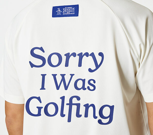 モックネックシャツの背面に配したバックプリント「ごめん、ゴルフやってた」という意味のゴルフあるあるメッセージがポップな印象に。