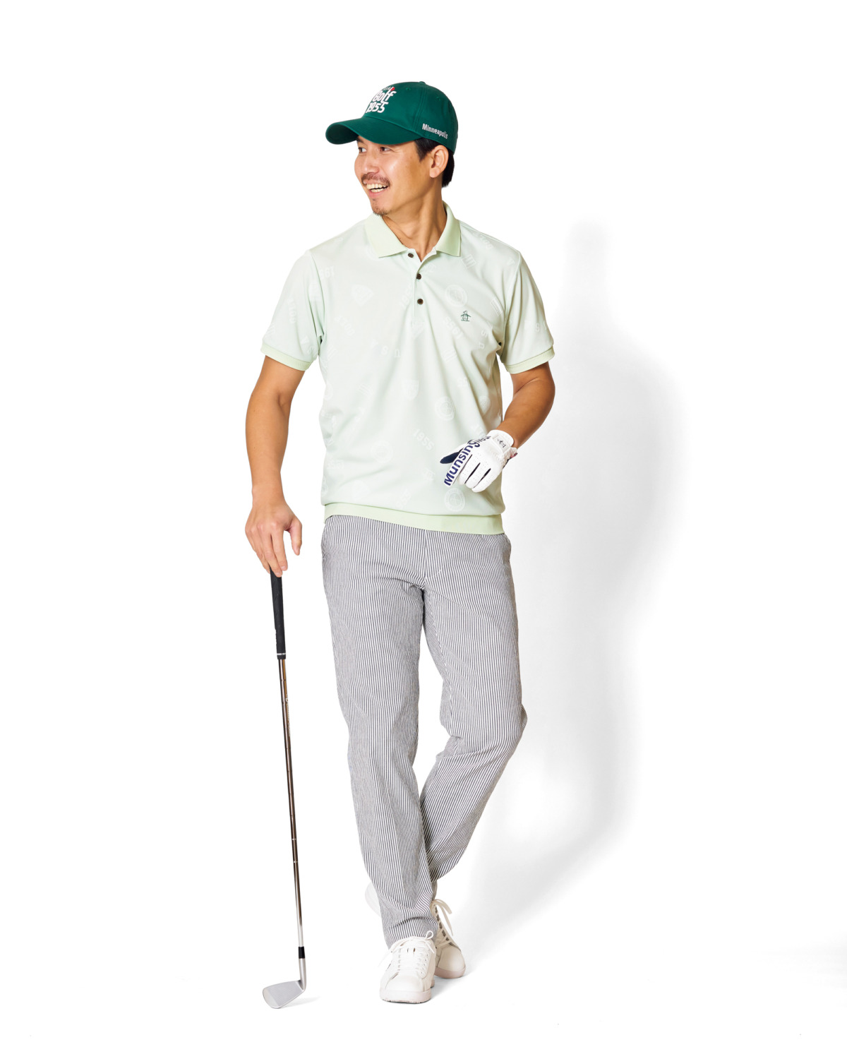 トレンドのセージグリーンカラーが上品な印象を与えてくれるジャカードポロシャツと爽快感のあるシアサッカー生地のパンツを合わせて、汗ばむ陽気でも清潔感が漂う、穏やかでリラックス感あるスタイリングに。キャップ¥7,480、ポロシャツ¥18,700、パンツ¥24,200、グローブ¥3,850、シューズ¥33,000(すべてマンシングウェア)、その他 スタイリスト私物