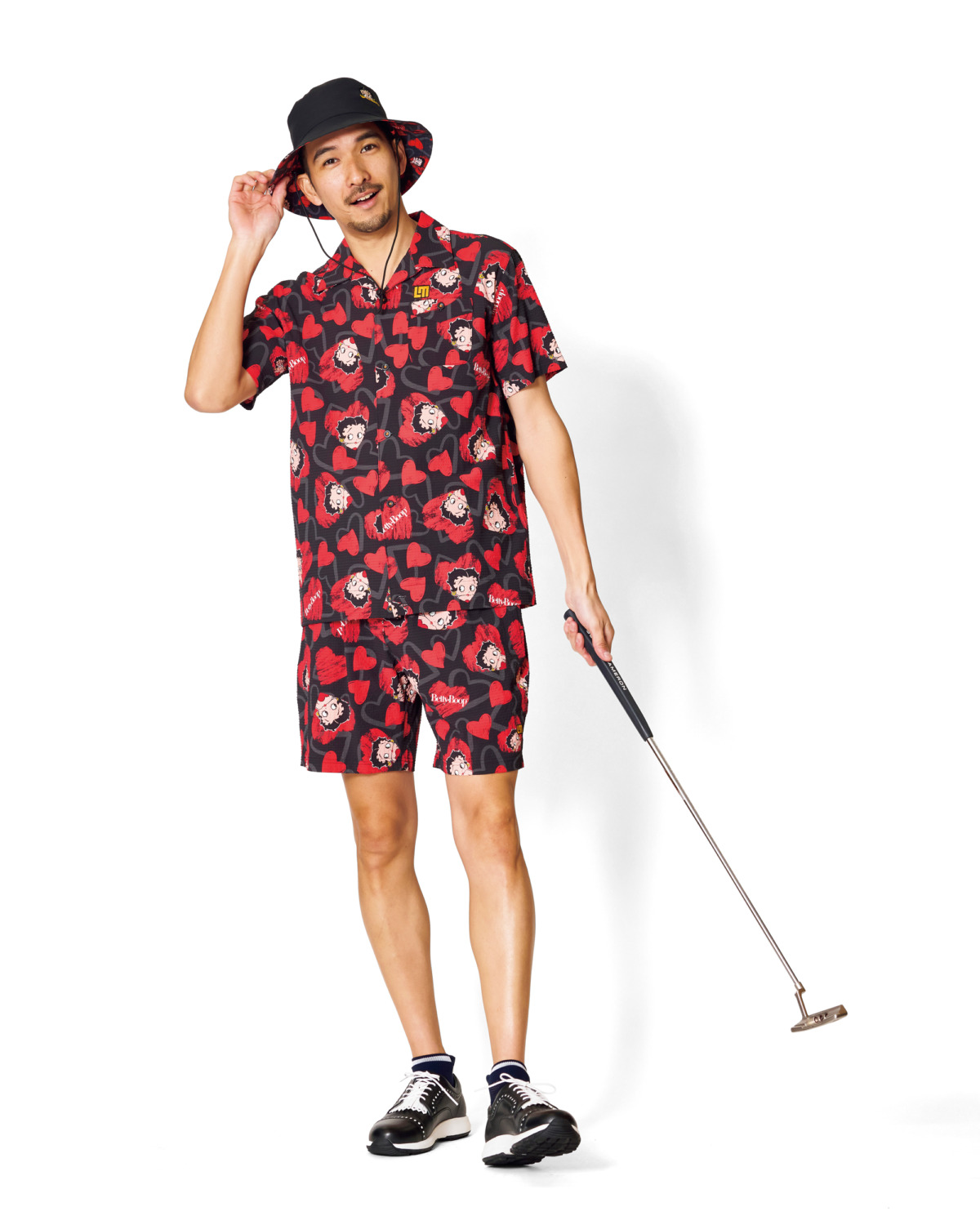 「Betty Boop™×LOUDMOUTH」のコラボシリーズ。クールな配色と愛らしさがミックスされたセットアップには、夏ゴルフも快適な凹凸感があり肌離れの良いサッカー生地を使用。リバーシブルハット¥7,150、ポロシャツ¥15,400、ショーツ¥14,300(すべてBetty Boop™×ラウドマウス)、ソックス¥1,650、シューズ¥33,000(ともにラウドマウス)、その他スタイリスト私物