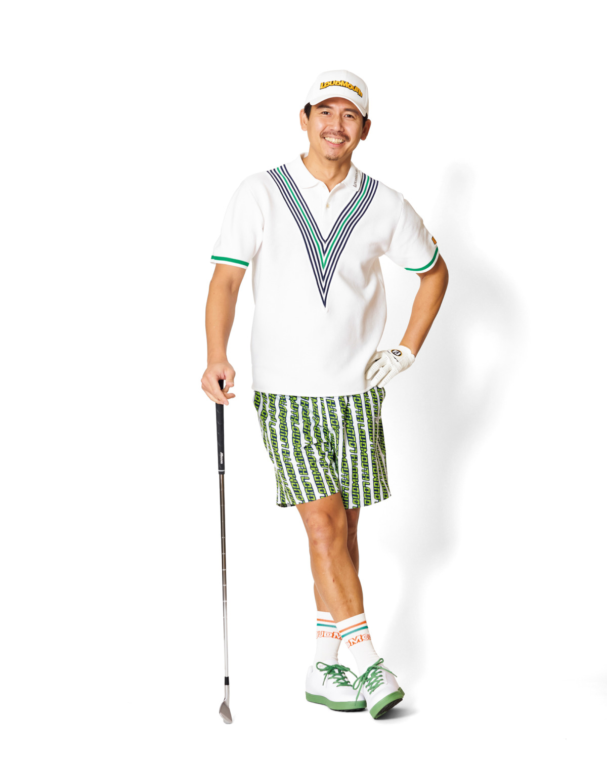 ニットポロシャツのアクセントカラーを拾ったブランドロゴ総柄ショーツや小物まで、白を基調としたクリーンな着こなしの中に遊び心をしっかり効かせ、大人のゴルフシーンに洗練された華やかさと楽しさをプラス。キャップ¥4,730、レイヤードポロシャツ¥14,300、ショーツ¥12,100、ソックス¥2,200、シューズ¥8,800(すべてラウドマウス)、その他 スタイリスト私物