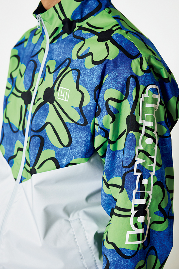 大胆な花柄の切り替えデザインが特徴のセットアップスタイル。耐水圧20,000㎜・透湿度29,000g/㎡24hの機能性と遊び心を兼ね備え、ゴルフシーンはもちろん、アウトドアやトレーニングでも快適に活躍するアイテム。同柄のポロシャツやショーツもラインナップする。ブルゾン¥19,800、パンツ¥16,500、シューズ¥8,800(すべてラウドマウス)、その他 スタイリスト私物