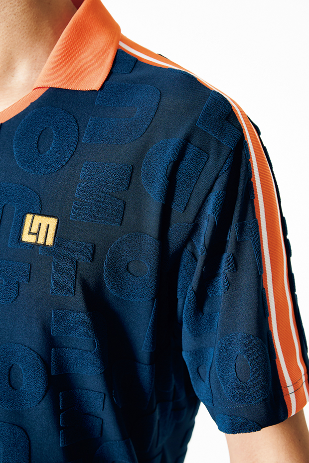 パイル生地のロゴを散りばめた立体感のある仕上がりが魅力のポロシャツ。派手な柄はなくても、充分に主役級の無地アイテム。