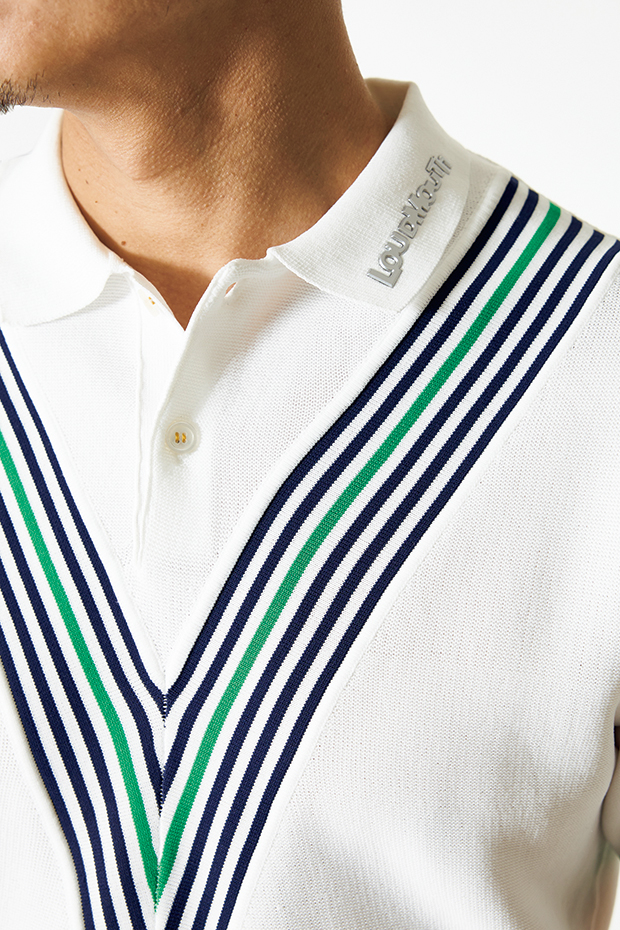 胸元のVライン切り替えが目を引くニットポロシャツは、これ一枚でキッチリ感がアップ。さまざまなコーディネートで活躍するアイテム。