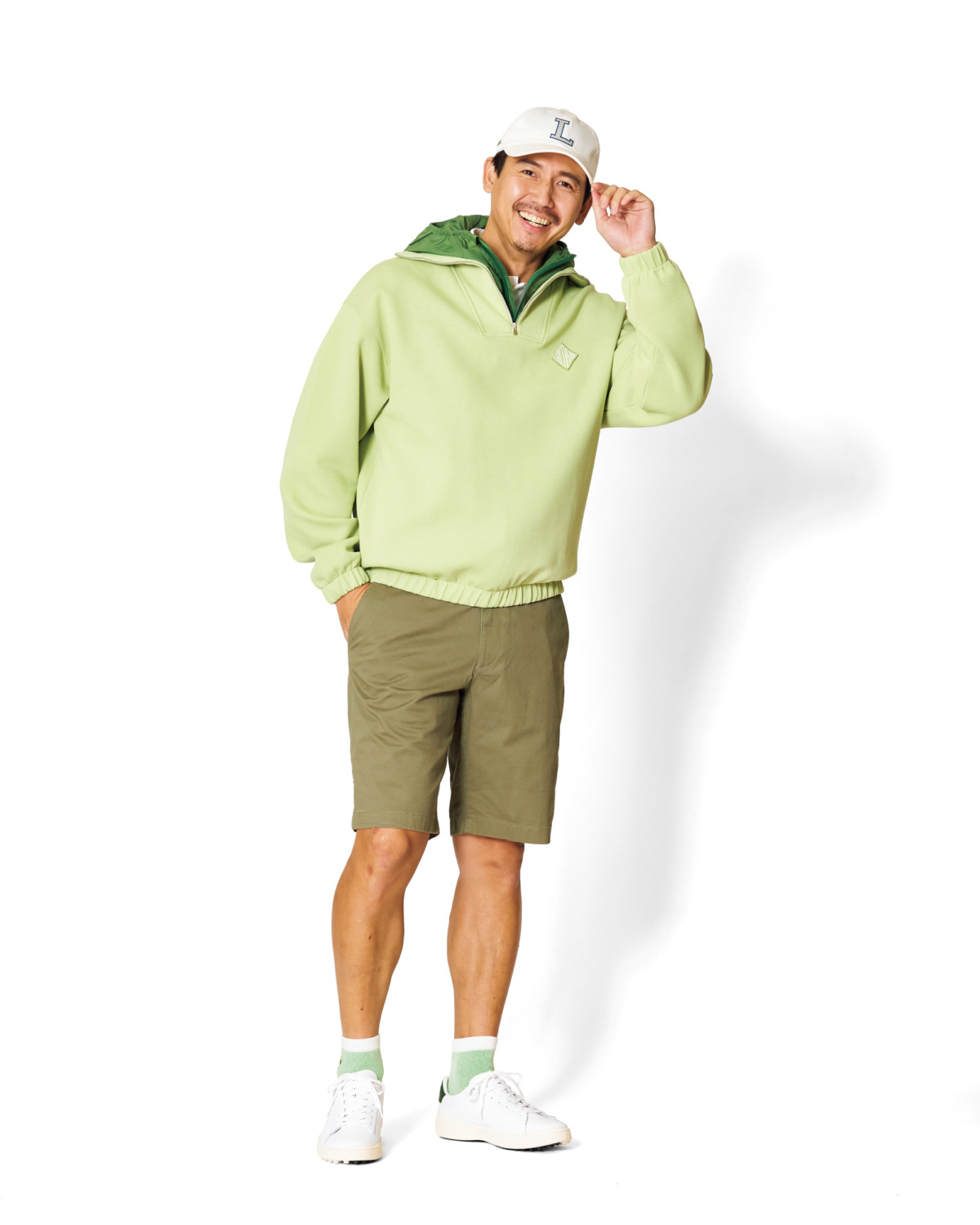 インラインコレクションからシーズナルカラーのセンチャカラーアイテムを使用し、爽やかなゴルフルックを完成。デイリーでも着回し可能なスタイリング。キャップ¥7,700、ハーフジッププルオーバー ¥25,300、パッカブルフーディ ¥27,500、ポロシャツ¥17,600、ショーツ¥13,200(5月発売予定)、ソックス¥1,870、シューズ¥15,950(すべてラコステ)、その他 スタイリスト私物