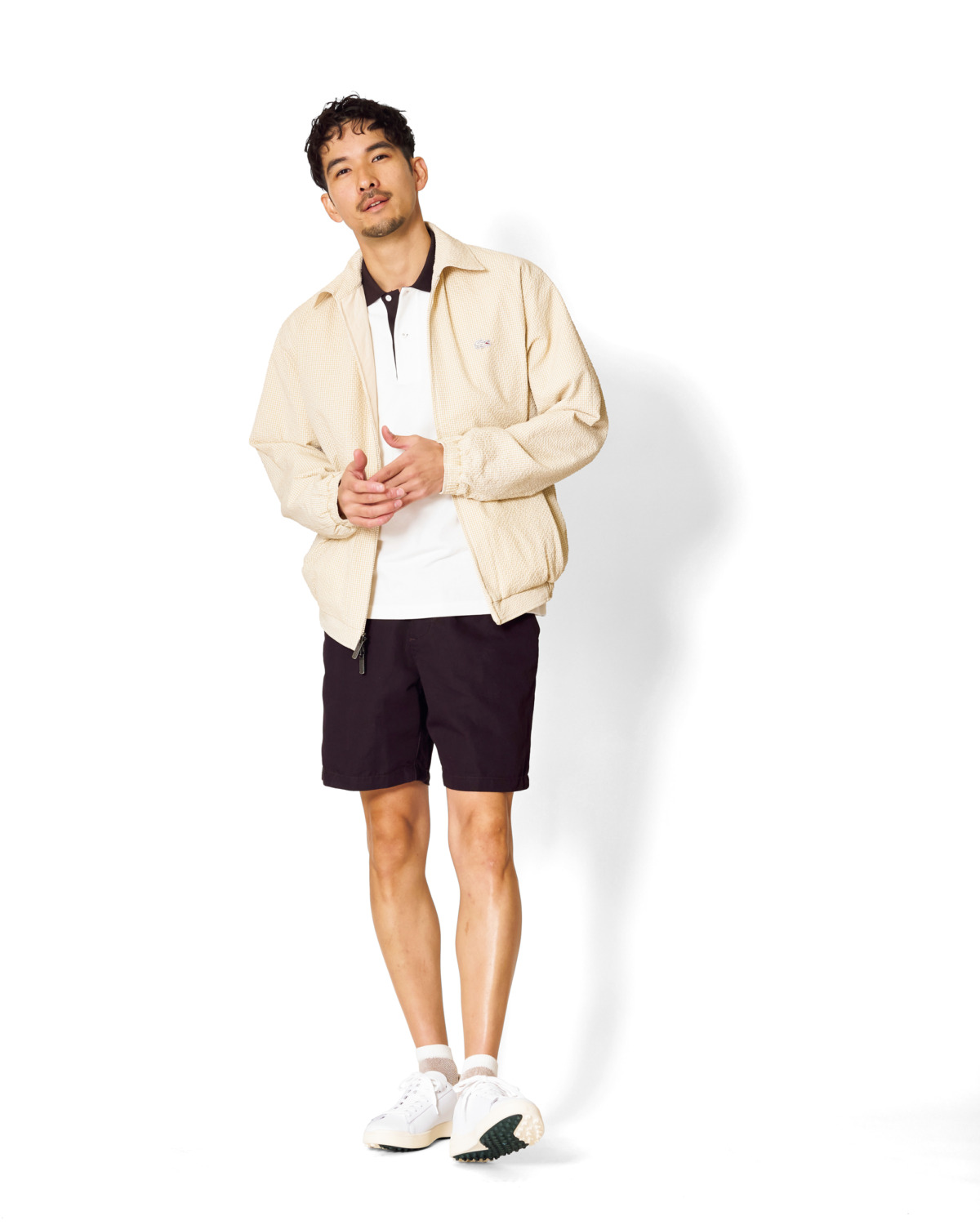 ランウェイコレクションのキーカラー・バッファローブラウンを基調とした、落ち着きと上品さを備えるスタイリング。ブルゾンは無地とトラッドなギンガムチェックを楽しめるリバーシブル仕様。リバーシブルブルゾン¥39,600、ポロシャツ¥17,600(5月発売予定)、ショーツ¥13,200(4月発売予定)、ソックス¥1,870、シューズ¥15,950(すべてラコステ)、その他スタイリスト私物