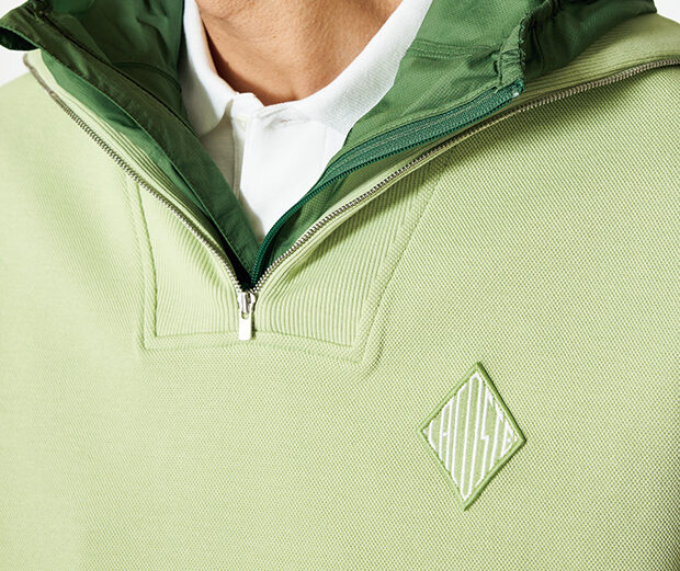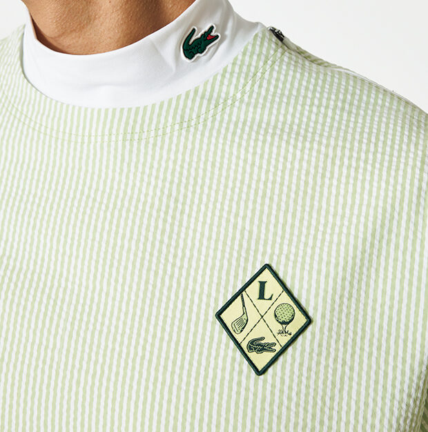 機能素材仕立てのシアサッカーシャツは着脱をスムーズにする左肩ジップオープンを採用。アーカイブ由来のゴルフパッチを左胸に。