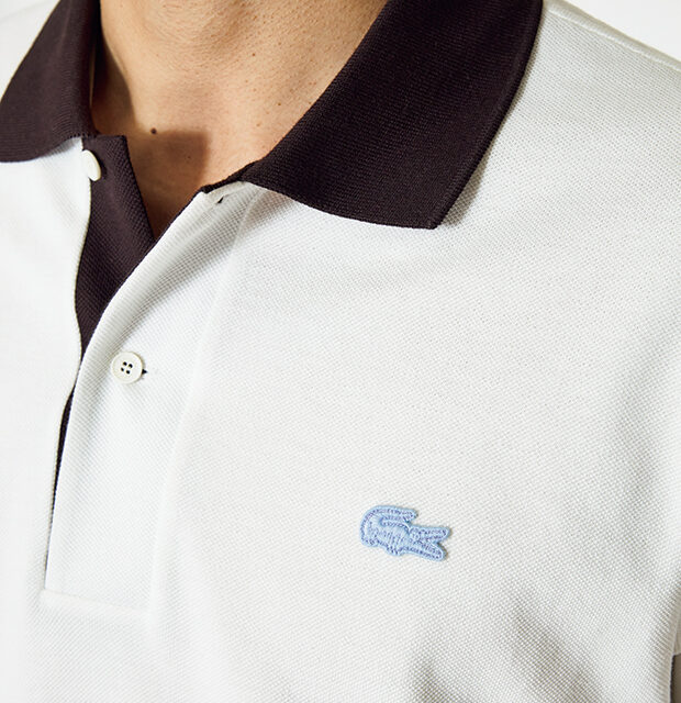 首元の印象を引き締めるバッファローブラウンとワニロゴのライトブルーの配色で、デザインにアクセントを加えたポロシャツ。