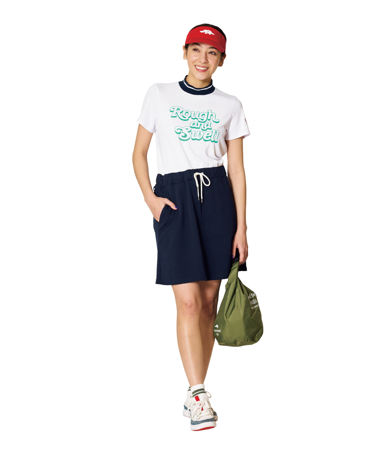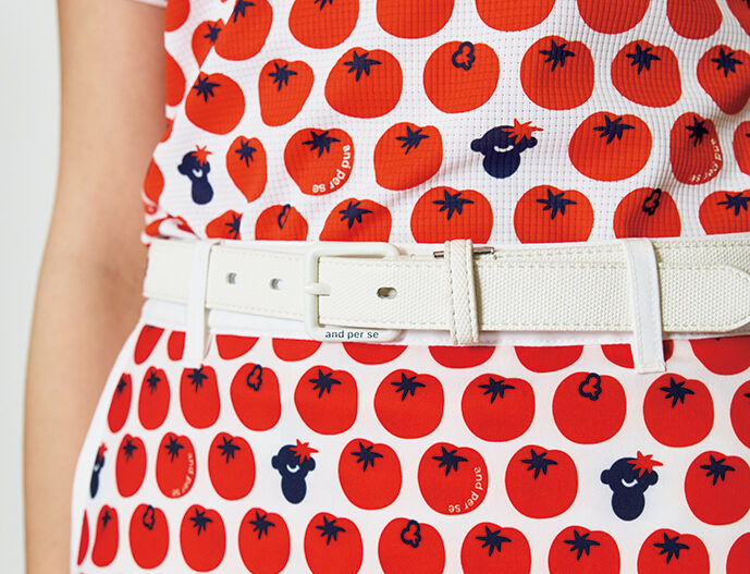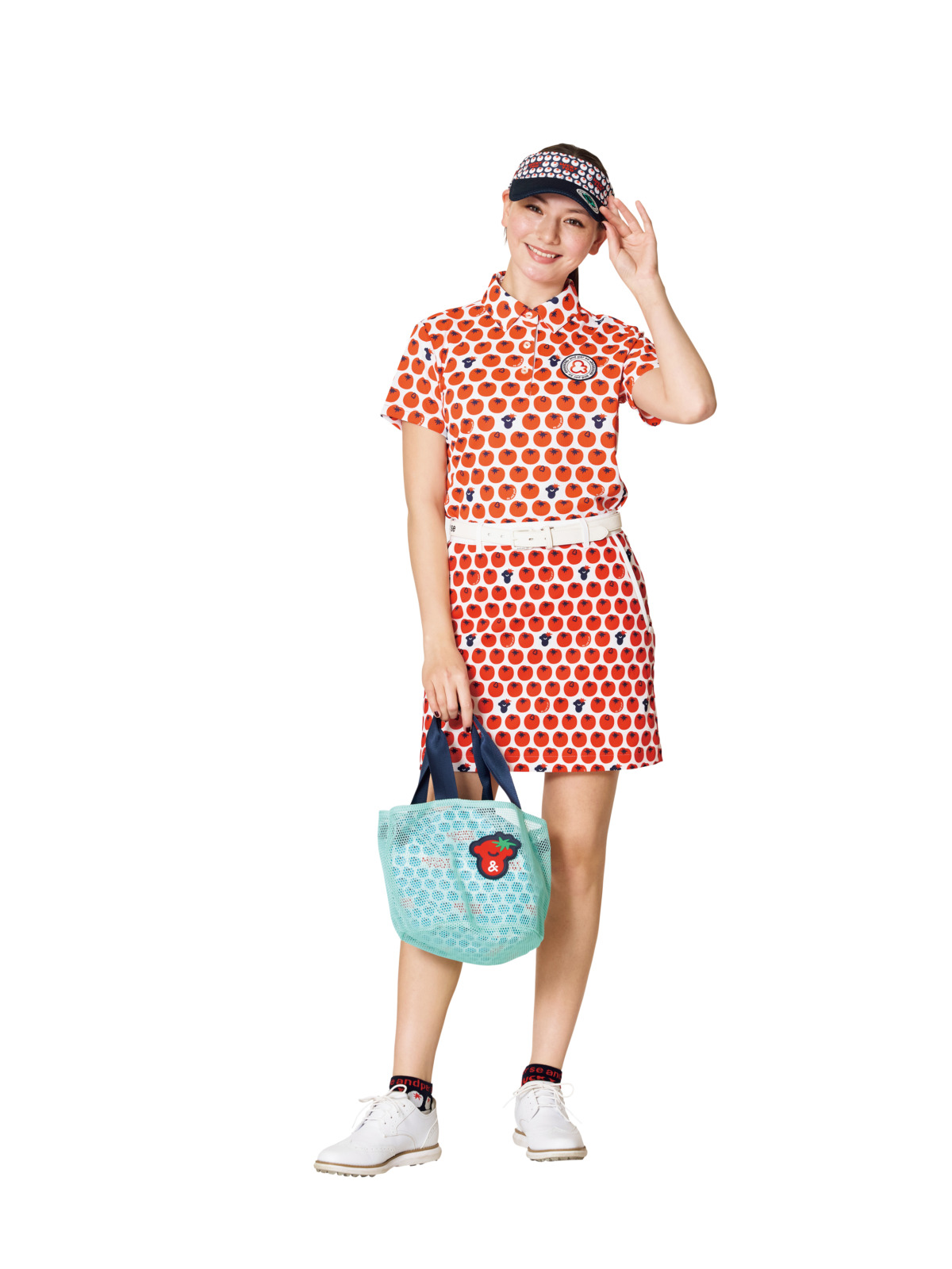 フレッシュなトマトモチーフのポロ!トマト×夏っぽい。ポロシャツとスカートをワンピース風に大胆セットアップ。透け感素材を使用したカートバッグにも、トマト仕様のアンパンジーを。ポロシャツ¥19,800 スカート¥19,800 サンバイザ¥6,600 ベルト、¥12,100 カートバッグ¥9,900 ソックス¥2,200(その他スタイリスト私物)、