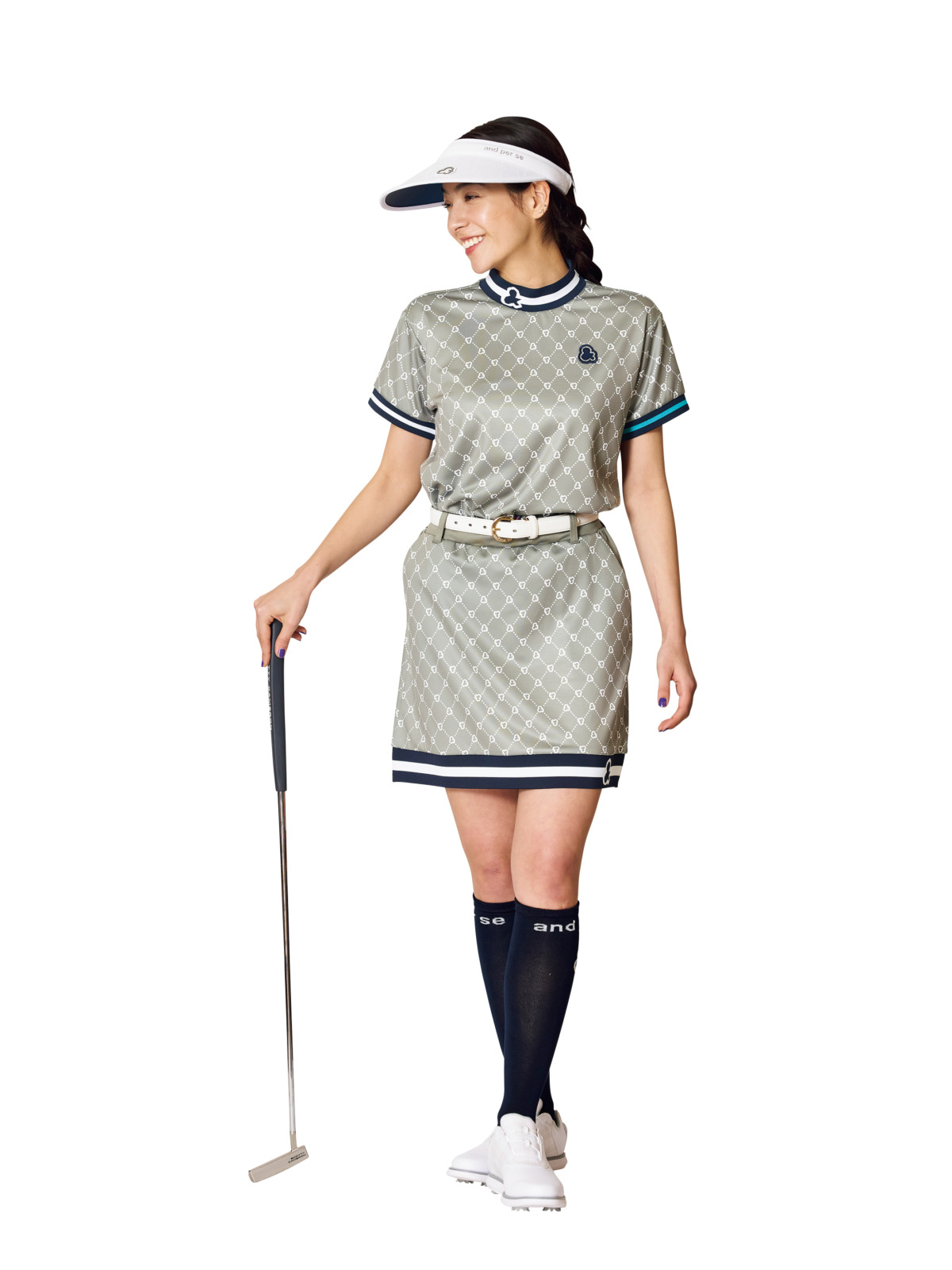チャコールグレーのハニカムメッシュセットアップは、抜群の伸縮性・通気性・速乾性を兼備した本格派モデル。白小物でスポーティな印象にまとめたスタイリングです。サンバイザー¥9,900、モックネックシャツ¥22,000、スカート¥29,700、ベルト¥16,500、ソックス¥3,300、磁気ネックレス¥27,500、キャディバッグ¥99,000(すべてバンデル)、その他スタイリスト私物