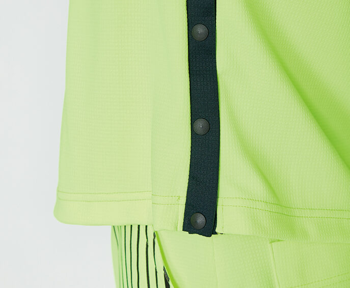 機能素材を使用したポロシャツは、フロントボタンが斜めになった特徴的なデザインを採用。すっきり感のあるスタイリングの程よいアクセントになっています。