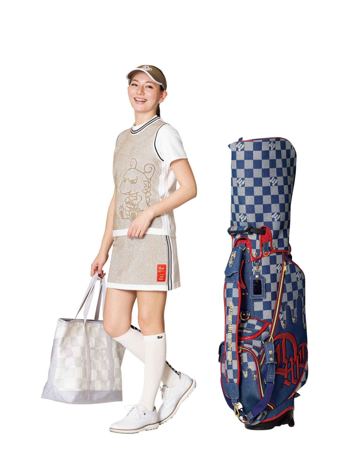 ボリューム感と高伸縮性を叶えたニット素材が生むラメの華やぎと配色ラインがレイヤードスタイルを彩ります。サンバイザー¥13,200、ニットベスト¥38,500(4サイズのみ¥41,800)、モックネックシャツ¥25,300(4サイズのみ¥27,500)、ニットスカート¥33,000、キャディバッグ¥148,500、トートバッグ¥35,200(すべてダンスウィズドラゴン)、その他スタイリスト私物