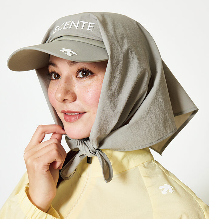 透けにくく快適な高機能リサイクル素材を使用したセットアップ。UVカット、遮熱性、ベタつきを抑えたサラッと感で爽やかに。シャープなライン使いが都会的なスポーティスタイルを演出します。サンバイザー¥13,200、モックネックシャツ¥26,400(4サイズのみ¥28,600)、スカート¥33,000、ヘッドカバー[Dr]¥25,300(すべてダンスウィズドラゴン)、その他スタイリスト私物
