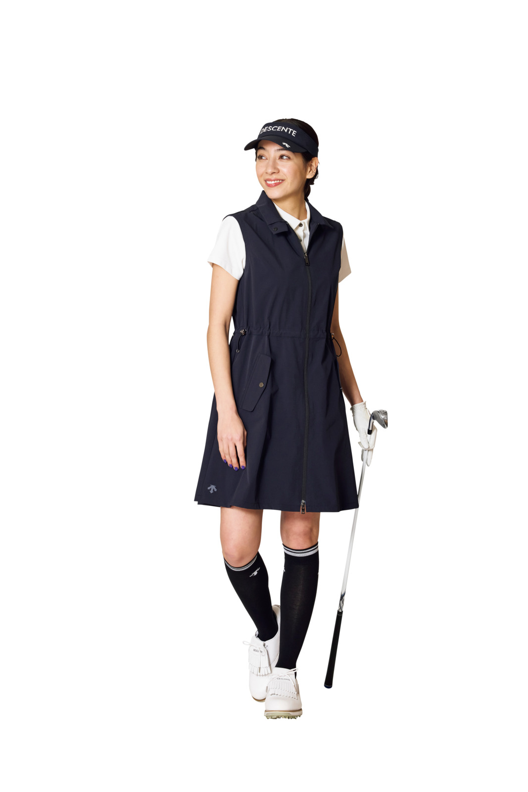 ウーブン素材を使用したアウターワンピースはサラリと羽織れるフルジップ仕様で、春先や肌寒さの残る梅雨時期にも活躍。合わせるアイテム次第でさまざまなレイヤードスタイルが楽しめ、小雨をはじく撥水性もあります。サンバイザー¥9,900、ワンピース¥35,200、ポロシャツ¥22,000、ソックス¥3,300(すべてデサントゴルフ)、その他スタイリスト私物