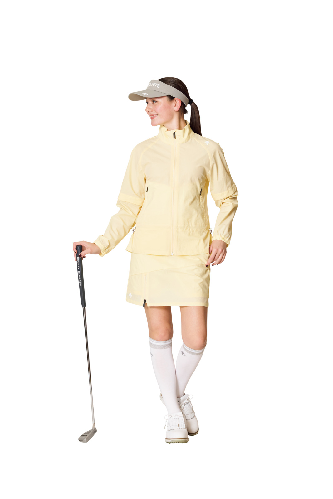 上品なマット感とナチュラルなシボ感が特徴のナイロンタフタ素材を使用したジャケットは、袖が取りはずし可能な2WAY仕様。ボトムスはショートパンツが合体してスカート見えする新アイテムです。サンバイザー¥9,900、ブルゾン¥39,600、ポロシャツ¥22,000、ショートパンツ¥26,400、ソックス¥3,300(すべてデサントゴルフ)、その他スタイリスト私物