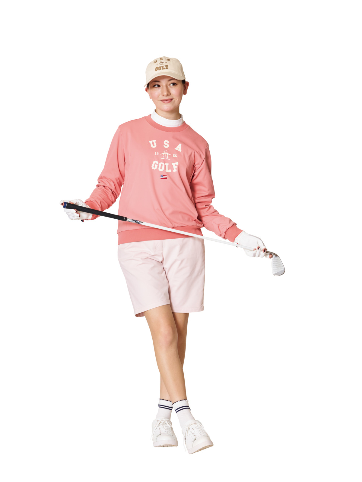 春めくピンクに同ブランドらしいロゴを乗せたクルーネックカットソーに合わせたのは、動きやすさと美しさを両立させた新定番ハーフパンツ。軽快な春のスタイリングです。キャップ¥6,160、カットソー¥24,200、モックネックシャツ¥15,400、ハーフパンツ¥22,000、ソックス¥2,200、シューズ¥33,000、グローブ¥7,700(すべてマンシングウェア)、その他スタイリスト私物