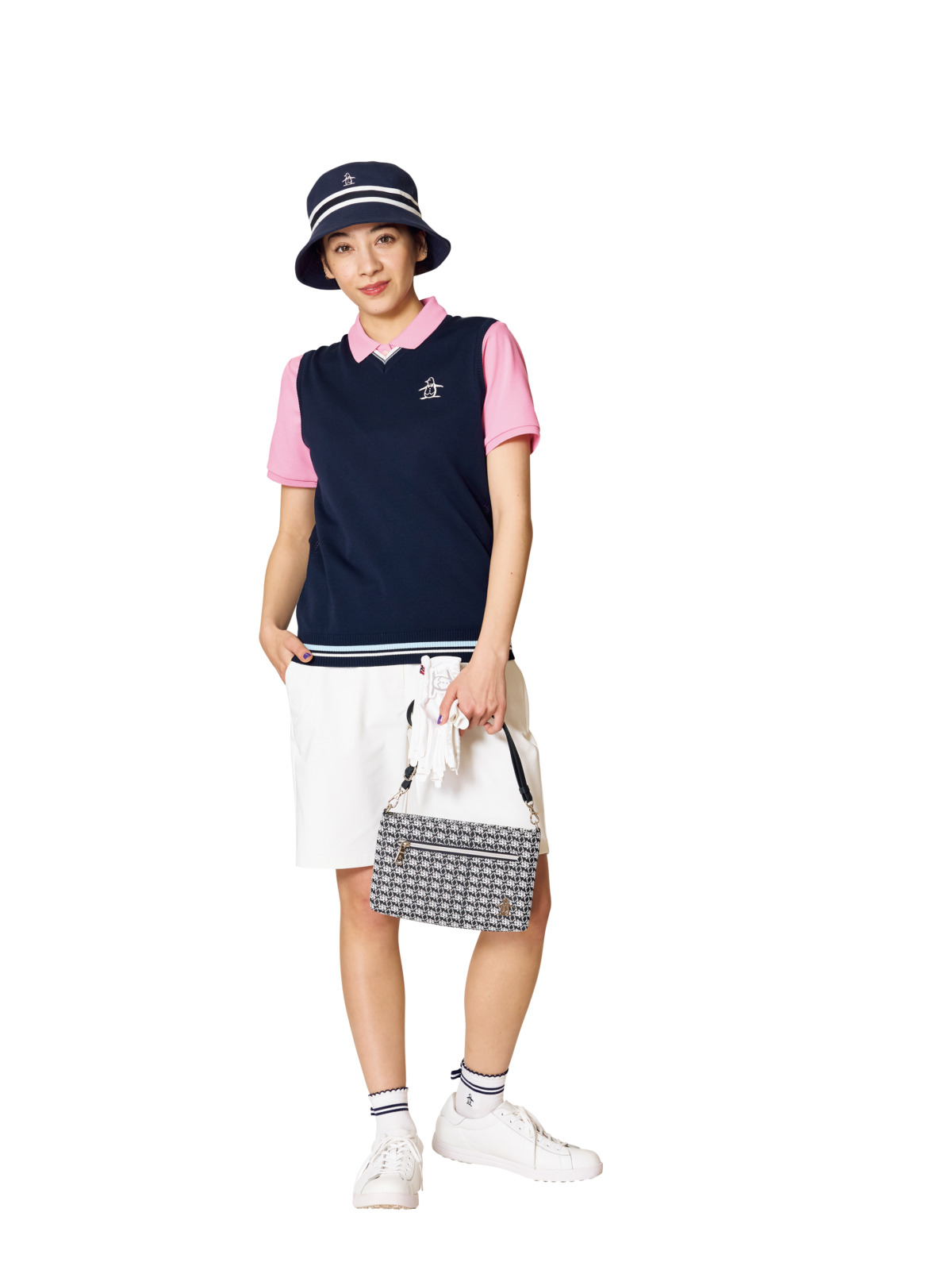 ブランドの核となる「アーカイブコレクション」を象徴するポロシャツをメインにしたシックなスタイリング。クラシックでありながらスポーティな印象に。古き良きデザインのパターカバーも添えて。キャップ¥7,150、ポロシャツ¥16,500、スカート¥19,800、2パックソックス¥5,280、ヘッドカバー[Pt]¥7,150(すべてペンギンバイマンシングウェア)、その他スタイリスト私物