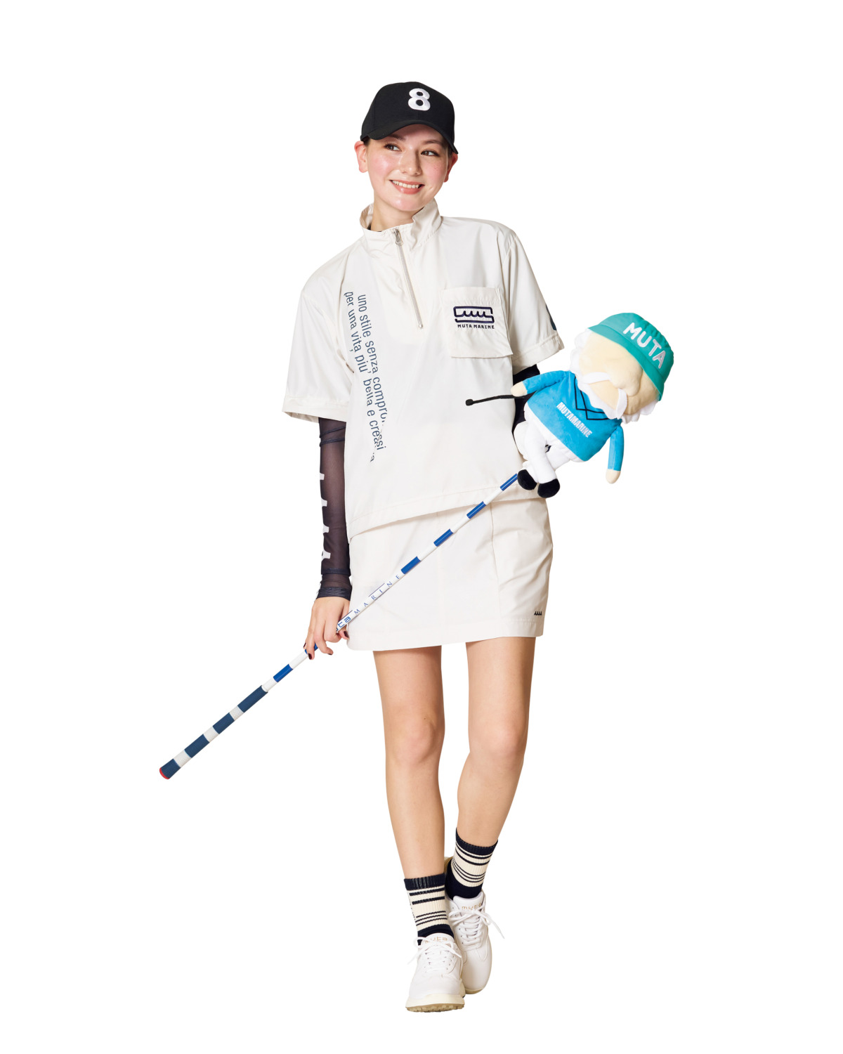 高い機能性とファッション性、どちらも兼ね備えたスポーティ感が漂うマリンルックコーディネートは、白とネイビーのカラーリングが春夏ゴルフにぴったりマッチします。サンバイザー¥9,350、ポロシャツ¥24,200、スカート¥30,800、ソックス(3足セット)¥6,600、シューズ¥41,800、カートポーチ¥33,000(すべてムータ・マリン)、その他スタイリスト私物