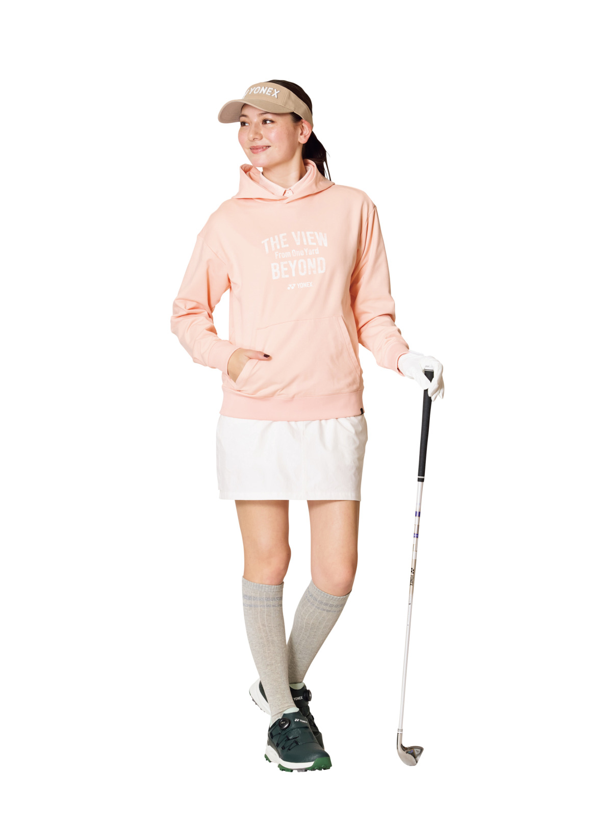 スイングのしやすさに配慮したカッティングを採用したフーディを主役にしたスタイリング。ショットからパッティングまでストレスフリーな着心地を実現。笑顔溢れるラウンドをサポートしてくれます。サンバイザー¥4,950、フーディ¥18,700、ポロシャツ¥13,200、スカート¥15,400、ソックス¥2,420、シューズ¥25,300、グローブ¥1,980(すべてヨネックス)