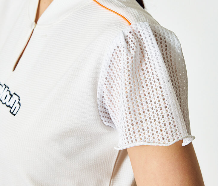 凹凸感のあるワッフル生地を使用したポロシャツの袖にあしらったメッシュ素材の透け感が、軽やかでフェミニンな印象をスタイリングに添えてくれます。