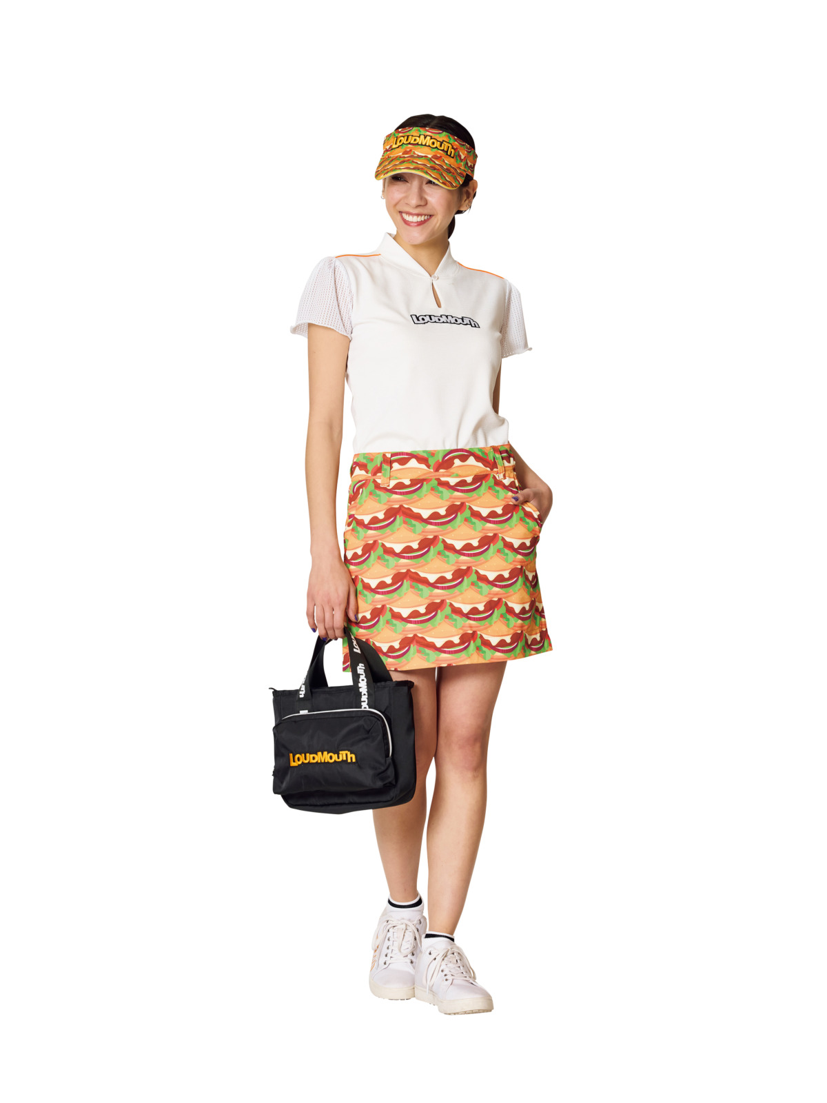 ハンバーガー柄を一層引き立たせる“柄×無地”のラウドマウス王道コーディネート。トップス袖のメッシュレースが女性らしさをプラス。それぞれのアイテムの個性を活かしたスタイリングです。サンバイザー¥4,950、ポロシャツ¥13,200、スカート¥12,100、ソックス¥1,650、シューズ¥10,780、カートバッグ¥7,700(すべてラウドマウス)、その他スタイリスト私物