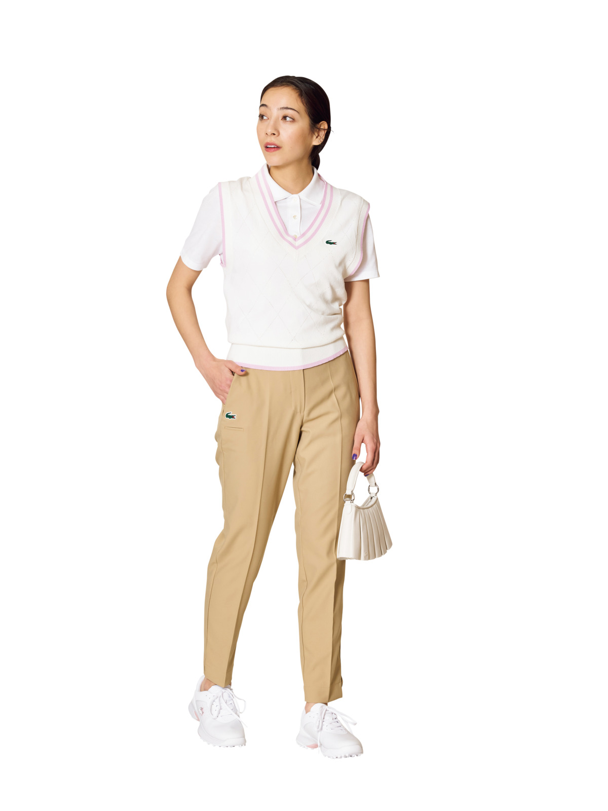 優等生顔のニットベストは、どんなコーディネートにも合わせやすく、活躍の幅が広いアイテム。プリーツスカートのコンセプトが効いたブランドのアイコンバッグ『ランラン』を添えて、ワンランク上のスタイリングを。ニットベスト¥19,800、ポロシャツ¥17,600、パンツ¥19,800、ソックス¥1,540、シューズ¥22,000、ミニバッグ¥28,600(すべてラコステ)