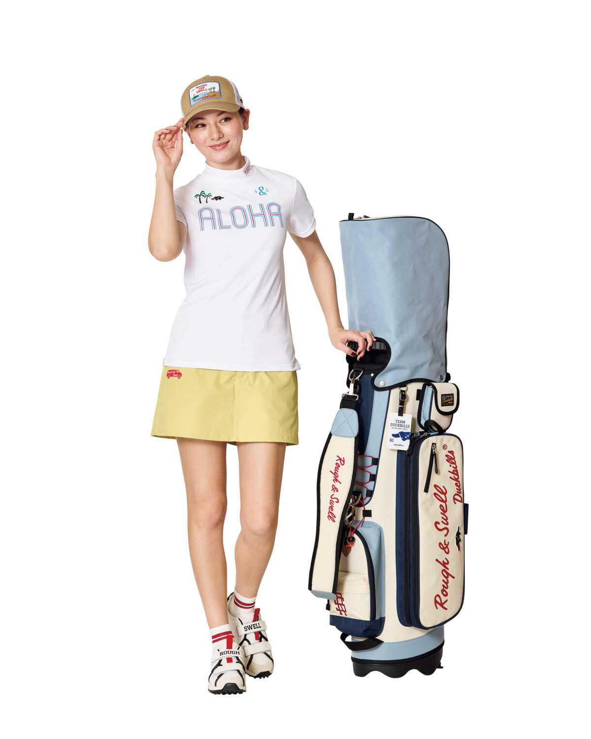 ホワイトのモックネックを主役に、スカート見えショーツパンツのイエローで一気に夏感を加速。刺繍が映えるキャップで南国カラーをさりげなくリンク。可愛さと動きやすさを両立したリゾートゴルフスタイルです。キャップ¥4,950、モックネックシャツ¥16,500、ショートパンツ¥20,900、ソックス¥1,980、シューズ¥27,500、キャディバッグ¥59,400(すべてラフアンドスウェル)