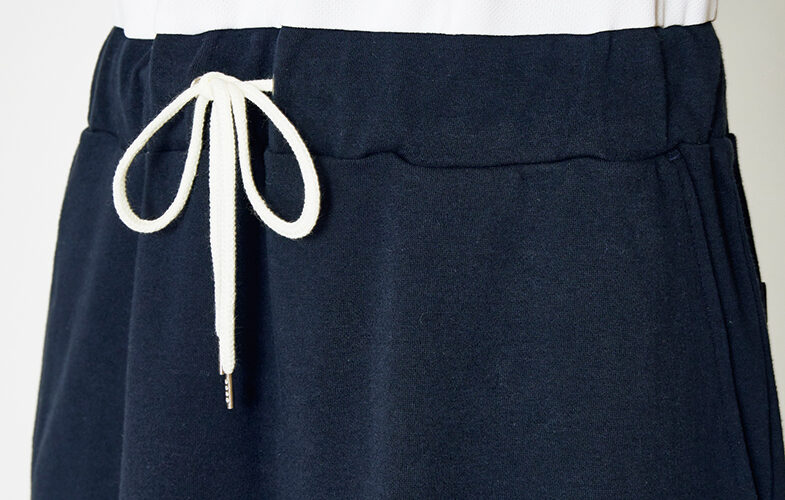 ウエスト部分で素材を切り替えたワンピースは、デザインのアクセントにもなるウエストのドローコードでシルエットの微調整が可能。自然にスタイルアップも狙えます。