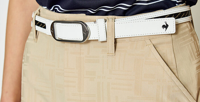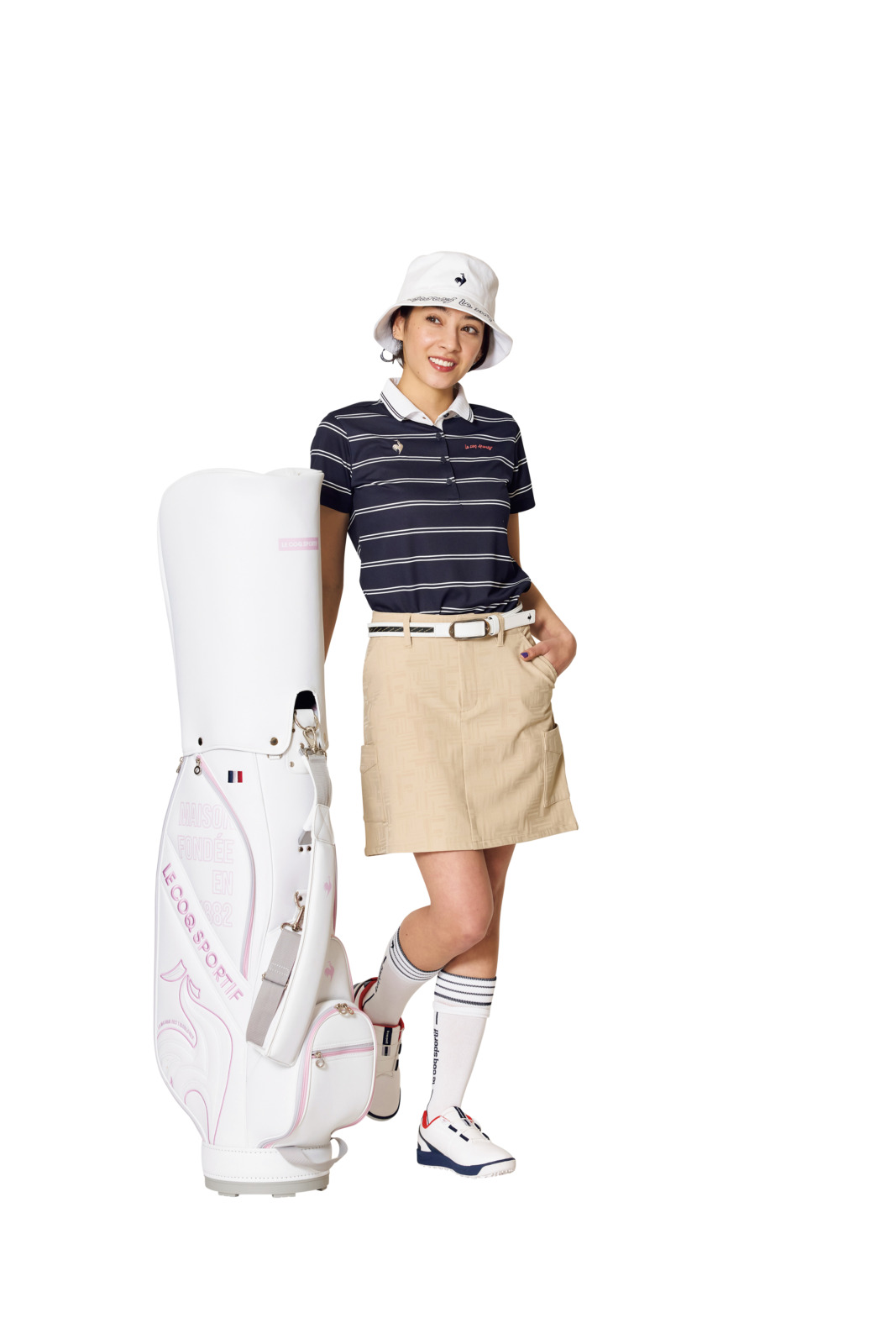 マリンボーダーのポロシャツとジャカード柄スカートで、フランスらしい上品なエッセンスを散りばめたマリンルックに。スマートで可愛らしい印象を演出したスタイリングです。ハット¥6,930、ポロシャツ¥11,550、スカート¥12,100、ベルト¥7,700、ソックス¥1,980、シューズ¥14,850、キャディバッグ¥36,300(すべてルコックスポルティフゴルフ)、その他スタイリスト私物