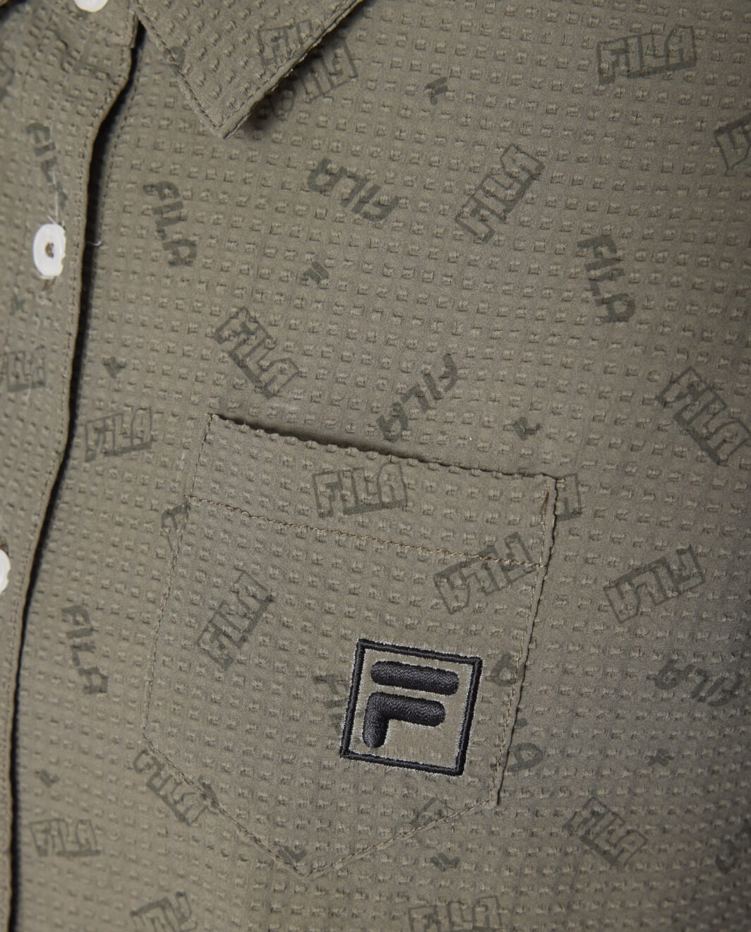 サラッとした着心地で軽量、シワも目立ちにくいシアサッカー生地に、ブランドロゴを散りばめたオープンカラーシャツ。