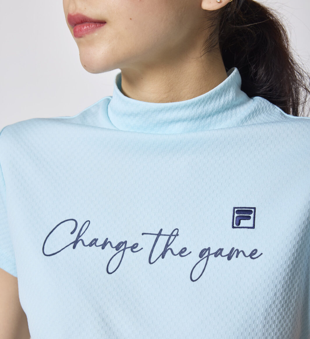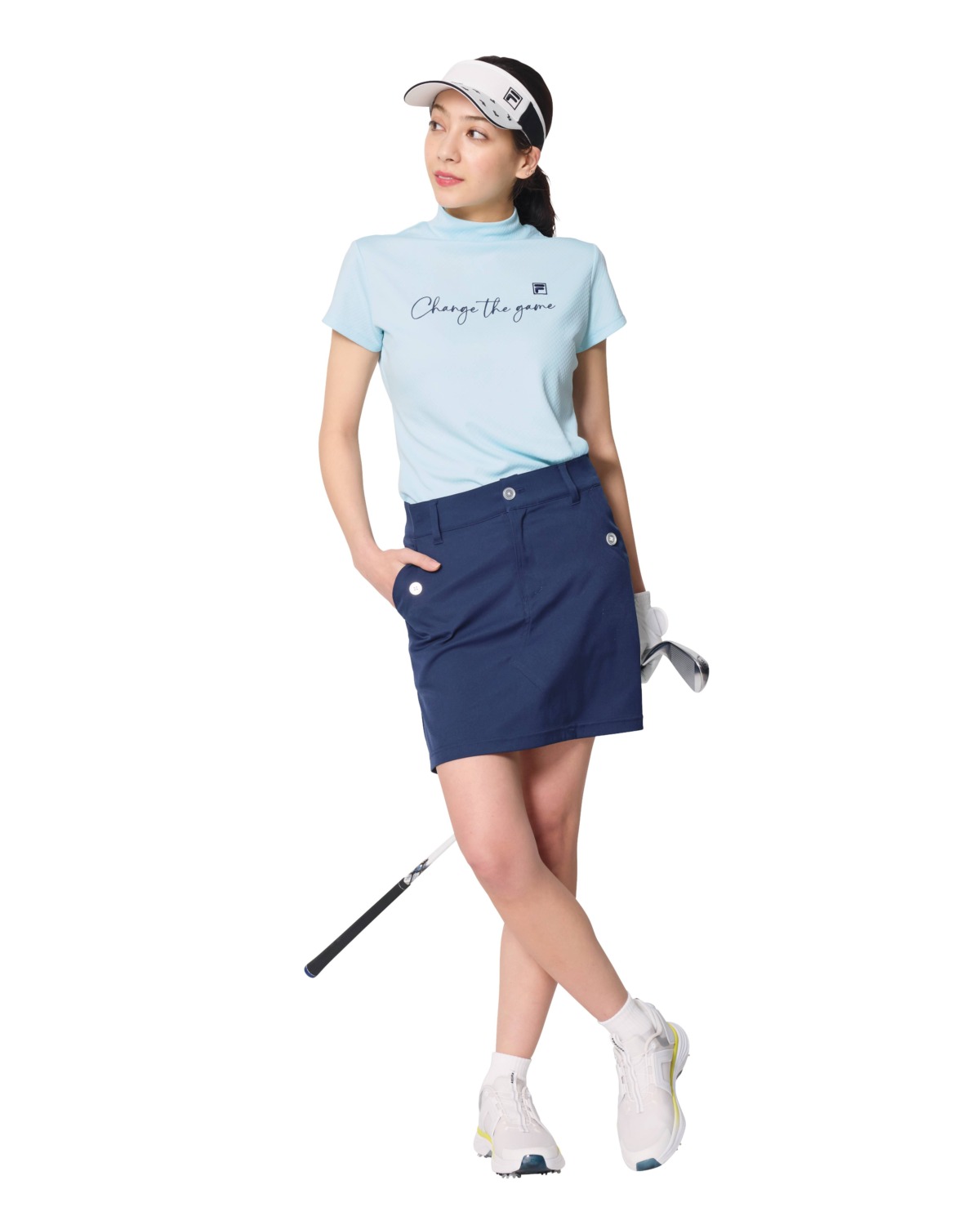 涼しげなアイスブルーのモックネックシャツにネイビーの台形スカートを合わせたシンプルなコーディネート。ホワイトのとび柄刺繍バイザーを合わせて全体的に爽やかな印象に。サンバイザー¥4,950、モックネックシャツ¥7,590、スカート¥9,350(すべてフィラ)、その他スタイリスト私物