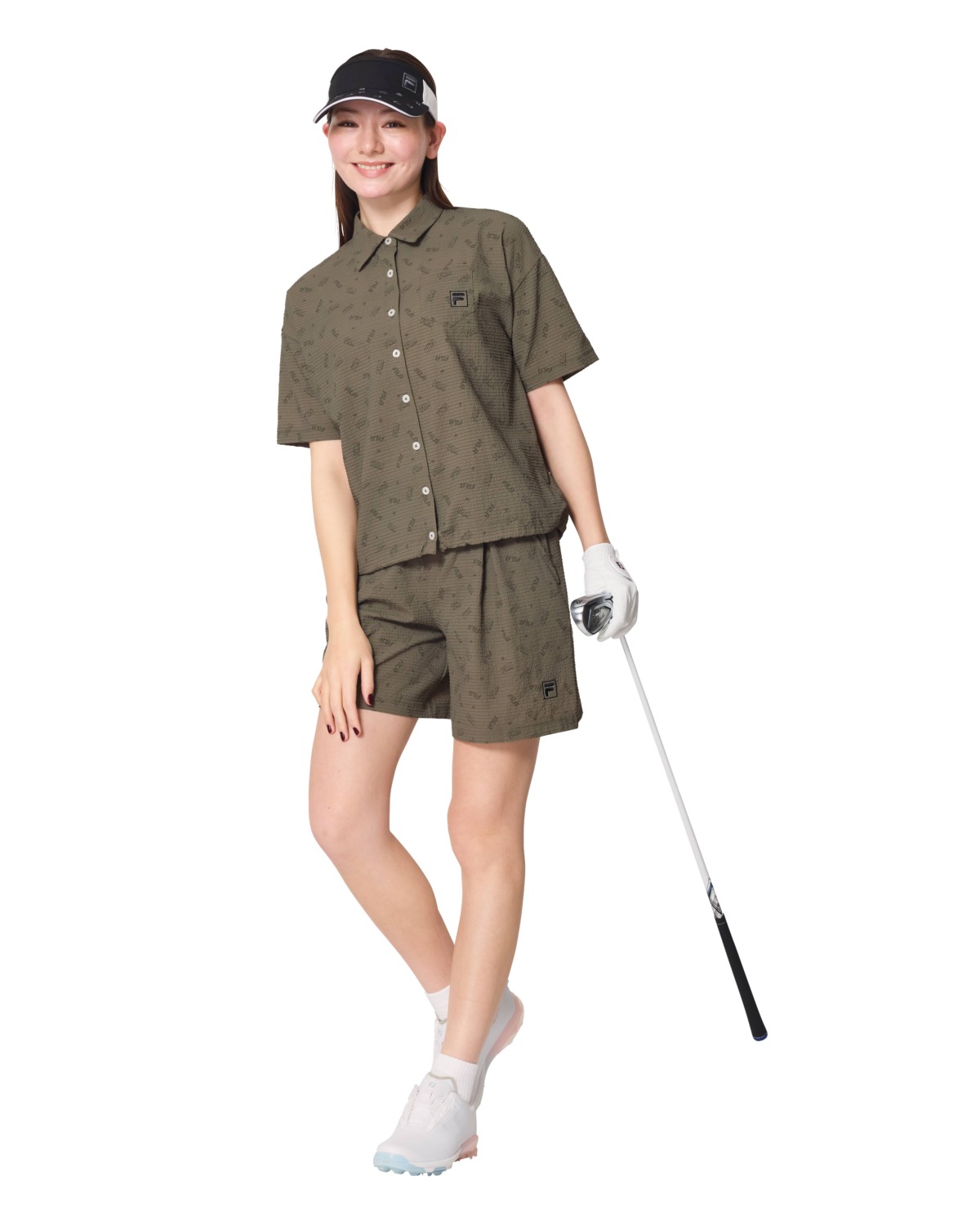 夏に最適な通気性と清涼感に優れたシアサッカー生地を使用したセットアップスタイル。快適さを確保しながら、落ち着いたダークカーキのアイテムで大人っぽさも感じられる、夏ゴルフの上級者コーディネートが完成。サンバイザー¥4,950、シャツ¥10,780、ショートパンツ¥10,450(すべてフィラ)、その他スタイリスト私物