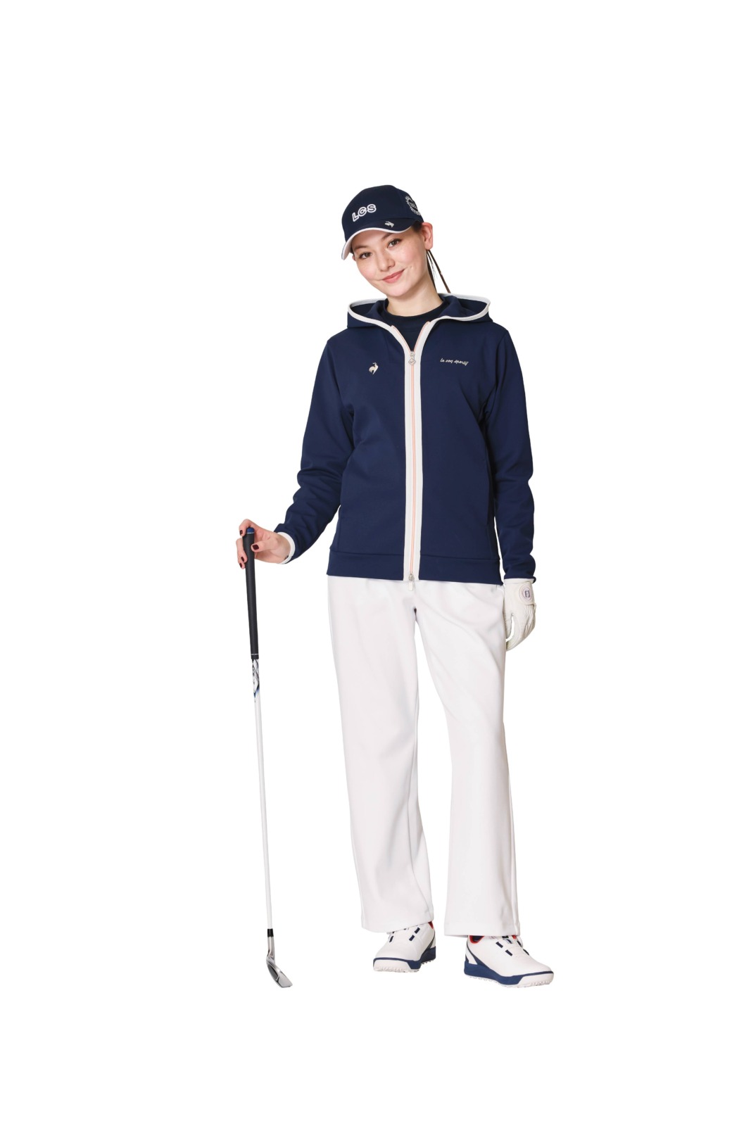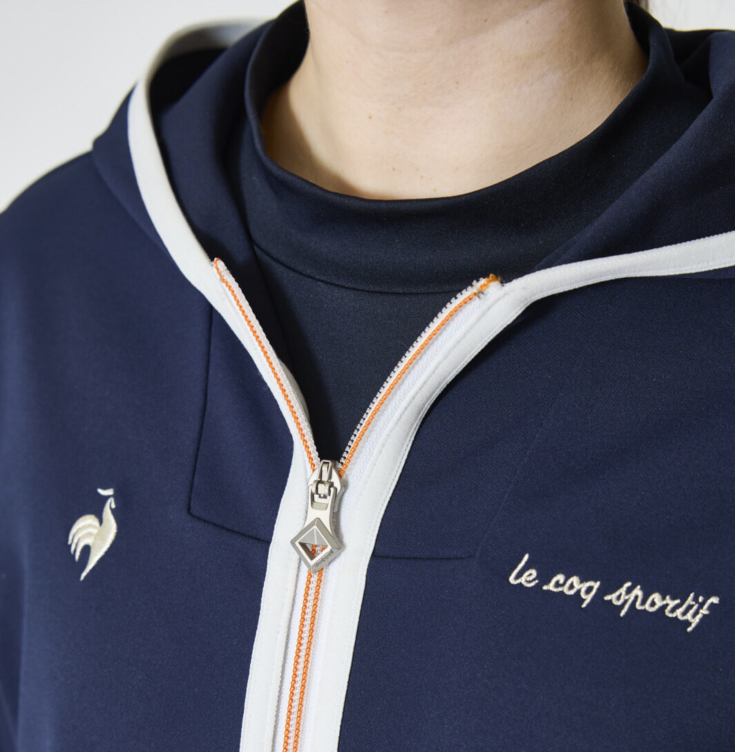 柔らかな質感のフーディにワンタックのセミワイドパンツを合わせることで、リラックス感がありながらも洗練された印象に。配色ファスナーや刺繍といった遊び心を効かせたスタイリング。キャップ¥4,400、フーディ¥14,300、モックネックシャツ¥11,550、パンツ¥13,200、ベルト¥7,700、ソックス¥1,430、シューズ¥14,850(すべてルコックスポルティフゴルフ)、その他スタイリスト私物