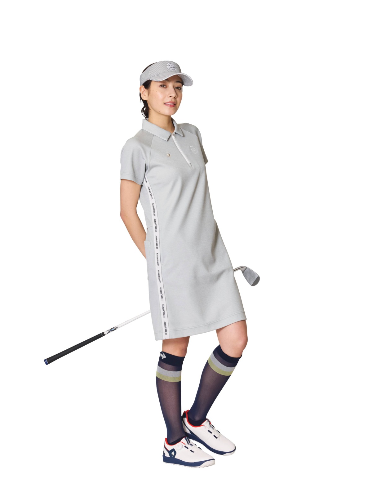 ソフトな質感の素材を生かして身体のラインを優しくカバーしながら上品な佇まいを演出。近赤外線と紫外線をカットすることでウェア内の温度上昇を抑える、クーリング機能を備えた備えたワンピーススタイル。サンバイザー¥4,400、ワンピース¥15,400、ソックス¥2,420、シューズ¥14,850(すべてルコックスポルティフゴルフ)、その他スタイリスト私物
