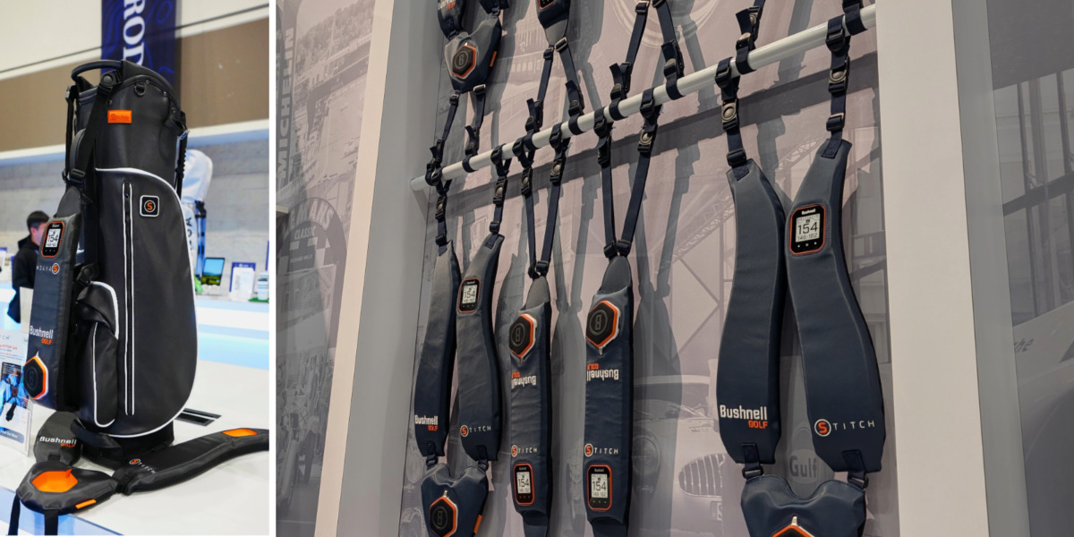 キャディバッグやヘッドカバーなどで知られるブランドが、距離計のトップブランド「Bushnell」とコラボ。GPS距離計やBluetoothスピーカーを内蔵したバッグ。ストラップのみでの販売も検討中。好きな音楽を聞きながら担ぎプレーを。