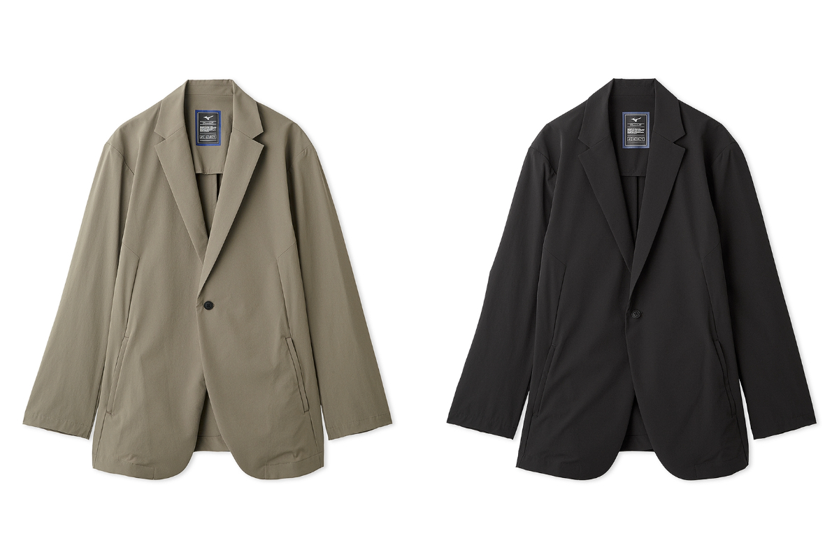 ジャケット(49,500円税込)とパンツ(24,200円税込)には、吸汗速乾性と接触冷感機能を備えたミズノ独自の素材『アイスタッチ』を採用しました。グレーベージュとブラックの2色展開で、単品での着用はもちろん、セットアップスタイルでの着こなしも可能です。ナイロンストレッチ素材を使用したラペルジャケットは、オリジナルの刻印入りボタンやランバードマークのプリントなど、細部にまでこだわったディテールが魅力です。
