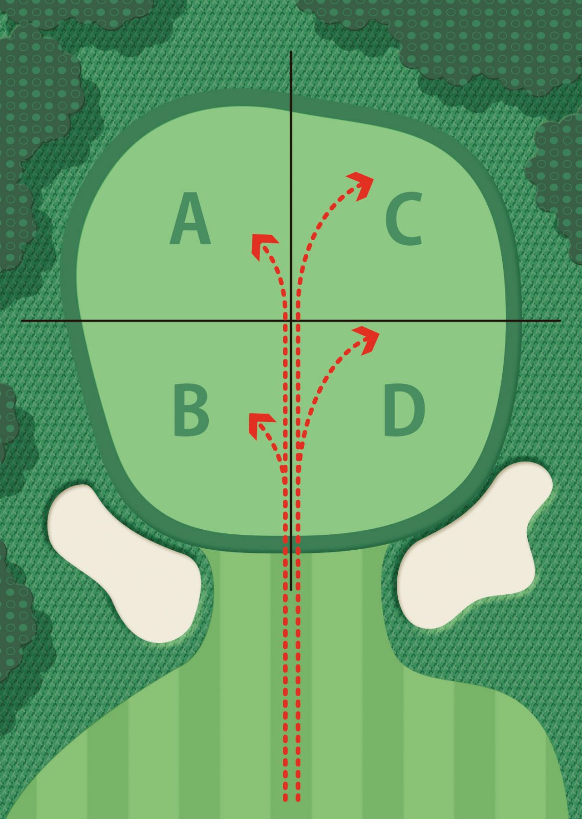 ツアープロは、グリーンを4分割にして緻密な戦術を練っています。下のイラストのようにA、B、C、Dの4つのブロックに分けて考えるのです。