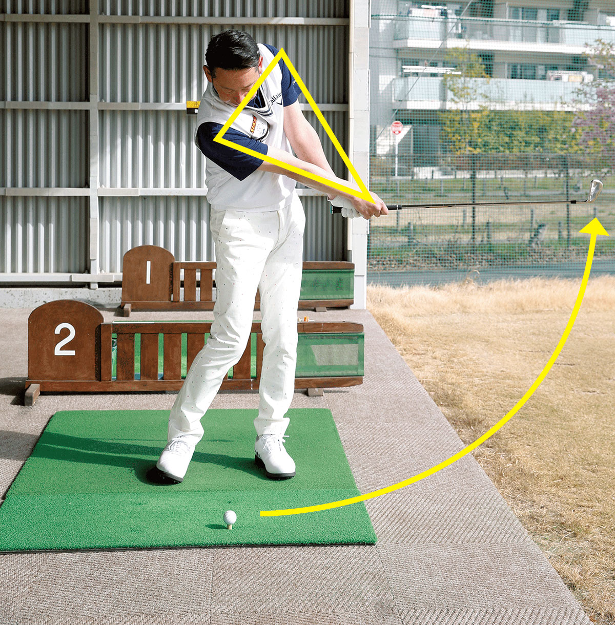 ハーフショットの練習でボールをまっすぐ打てるようになったら、振り幅を少し大きくしましょう。トップは時計の針の10時、フィニッシュは2時の高さが目安です。スイングが大きくなっても飛距離を出そうと思わないこと。ハーフショットと同様、フェースの芯にきちんと当てる感覚をつかむのが目的ですから、インパクトエリアの軌道をイメージして打ちます。
