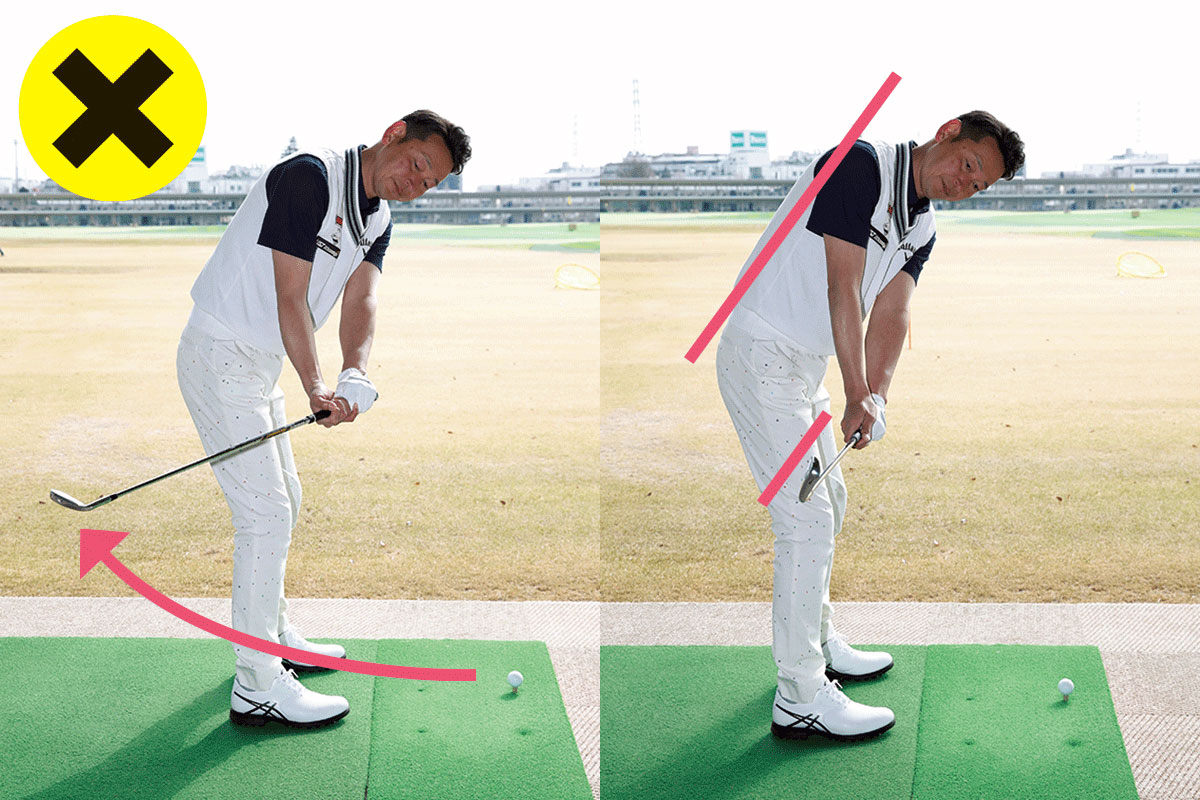 初心者はテークバックでフェースが開きやすいので注意しよう。右腰の高さでクラブを止めて、フェースと背骨の傾きが揃っているかを確かめてみよう。