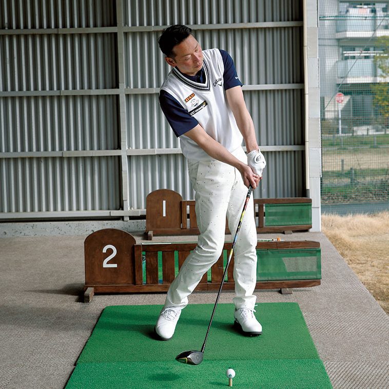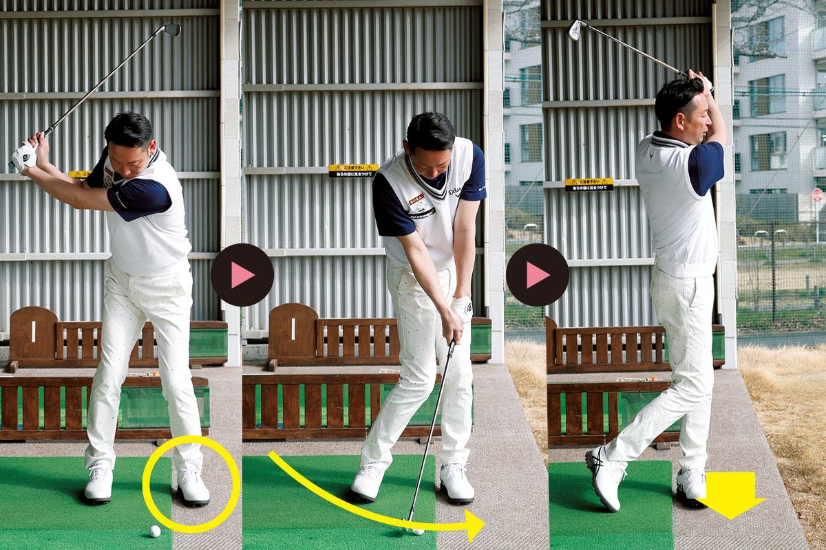 左足を右足よりも低くした状態でスイング練習すると効果的。