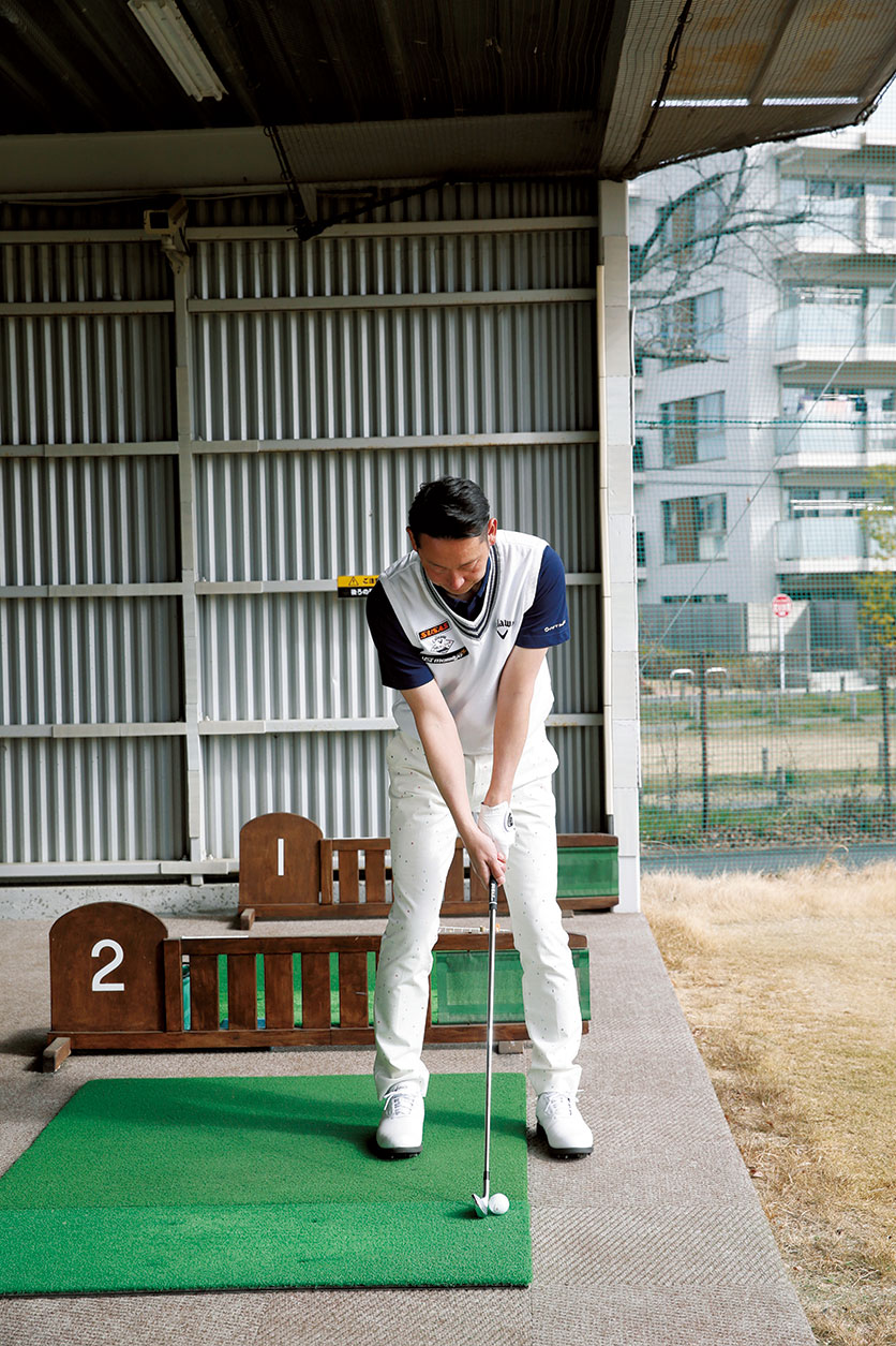 アイアンのダフリを直すには打席のマットの左端のスペースを利用し、左足をマットから外して構えましょう。こうすると左足が少し低くなり、インパクト後にクラブヘッドを低く出しやすくなります。ダウンスイングで上体が右に傾くクセを矯正でき、ダフリが直ります。