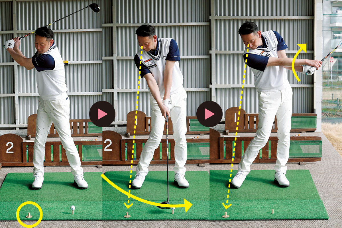 (右)ボールの右側に置いたゴムティを見続ければ体の開きを抑えられる。