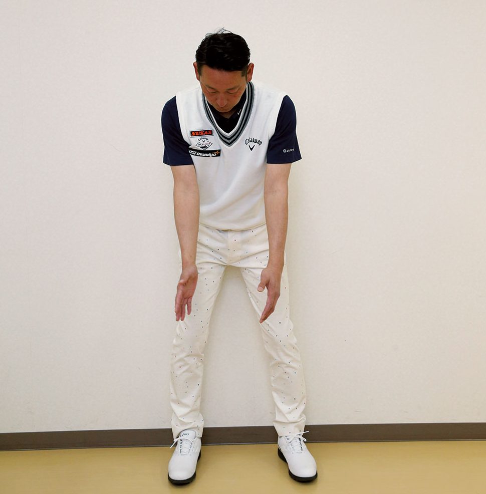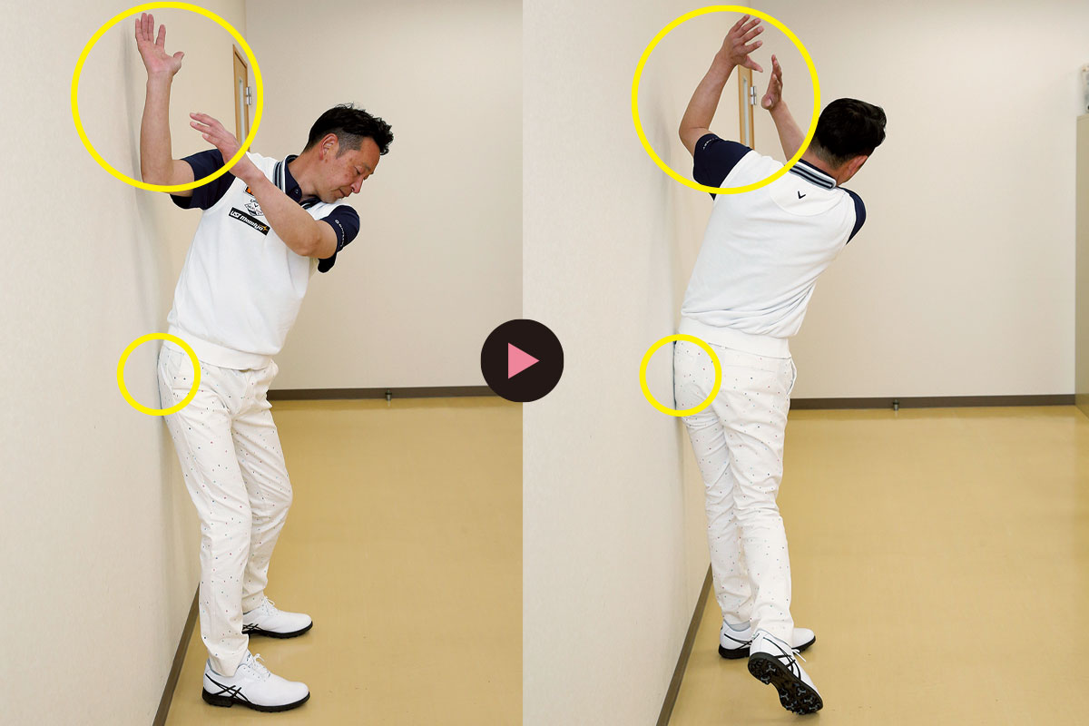 まずお尻を壁に軽くつけてアドレスの前傾姿勢をつくります。両足のカカトは壁から少し離します。そしてお尻が壁から一度も離れないように腕を振りましょう。バックスイングでは右のお尻を、インパクトエリア以降は左のお尻を壁にしっかりつけておくように意識します。