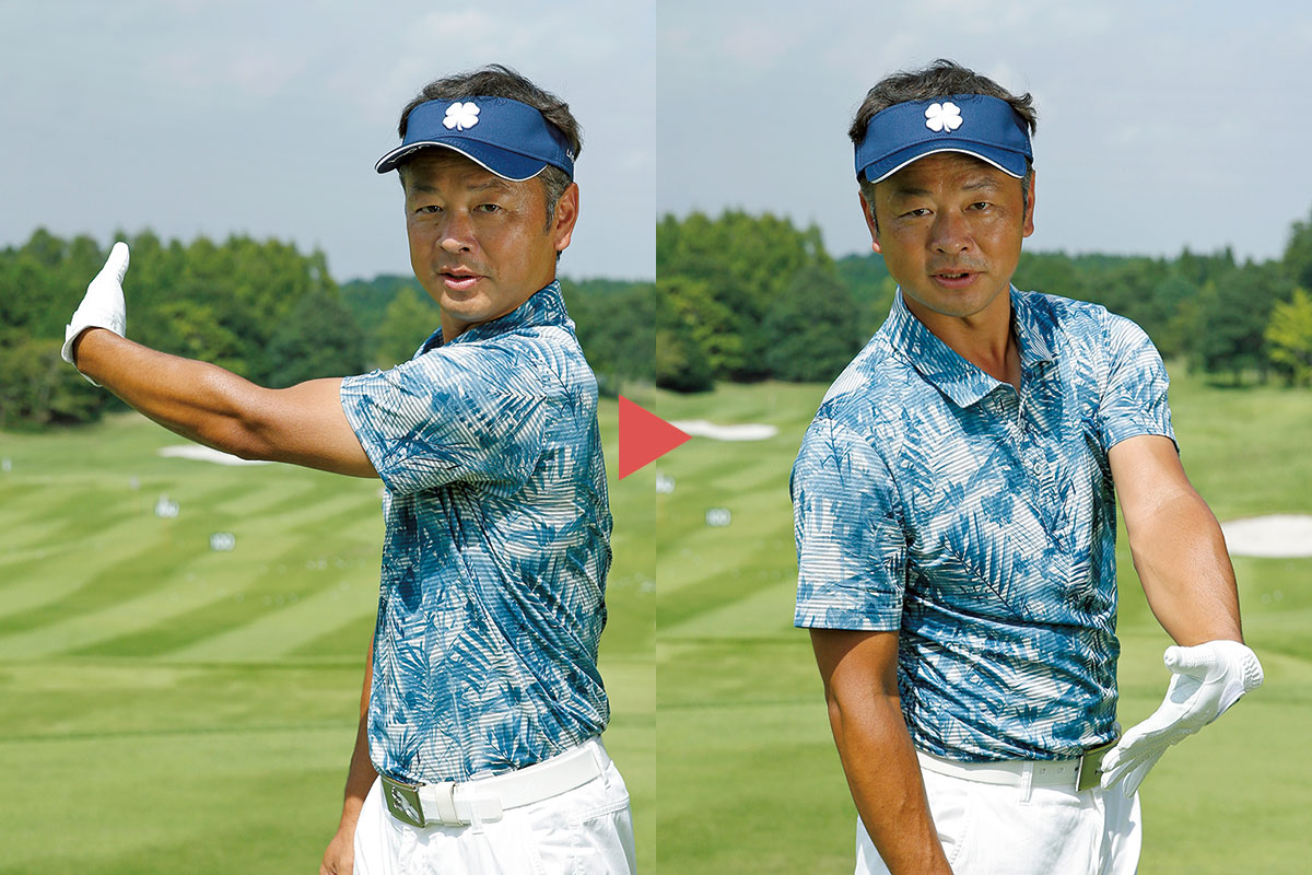 直立の姿勢でクラブを水平に振り、左手首をどう折り曲げればフェースがスクエアに戻りやすいかを体感してください。左手首が甲側に折れるとフェースが大きく開きますが、左手首の掌屈と左前腕部の外旋を連動させれば、フェースを返しやすいことがよくわかります。