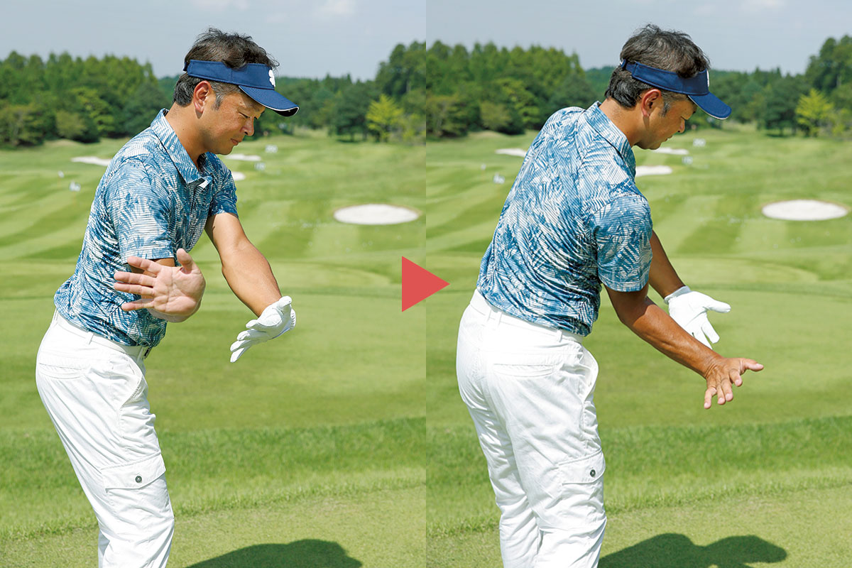 右手首は左手首の掌屈と同調して「背屈」させましょう。右手のひらを甲側に折れば両手首を同じ向きに屈曲でき、ハンドファーストの形がつくれます。逆に、左手首が背屈し、右手首が掌屈してしまうとハンドレートのインパクトになり、ダウンブローにヒットできません。30