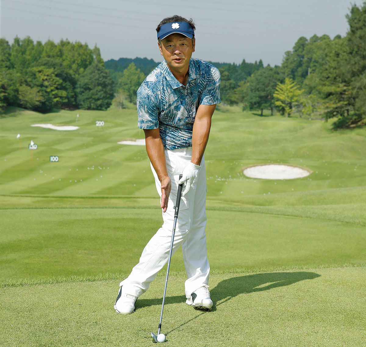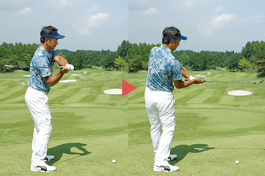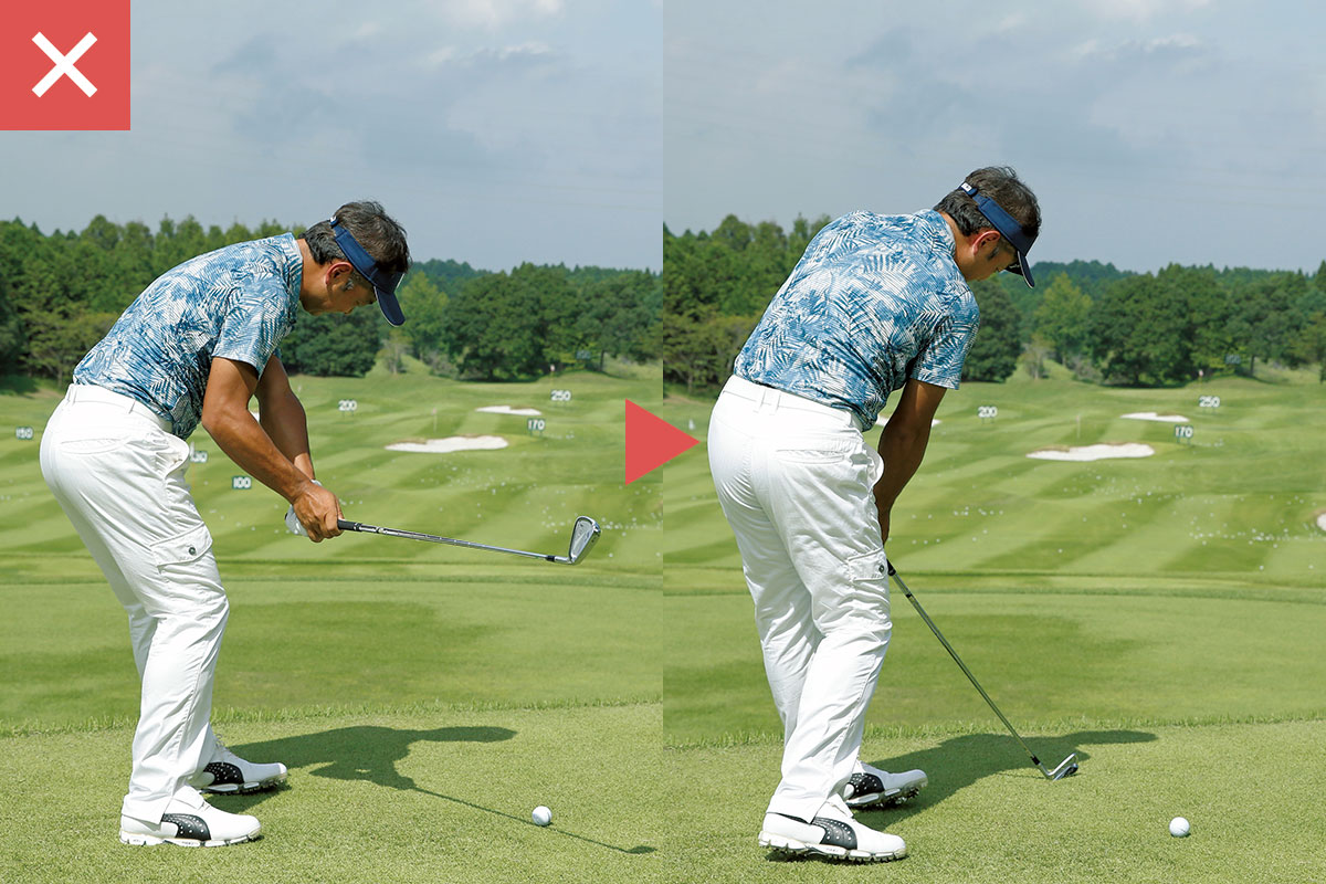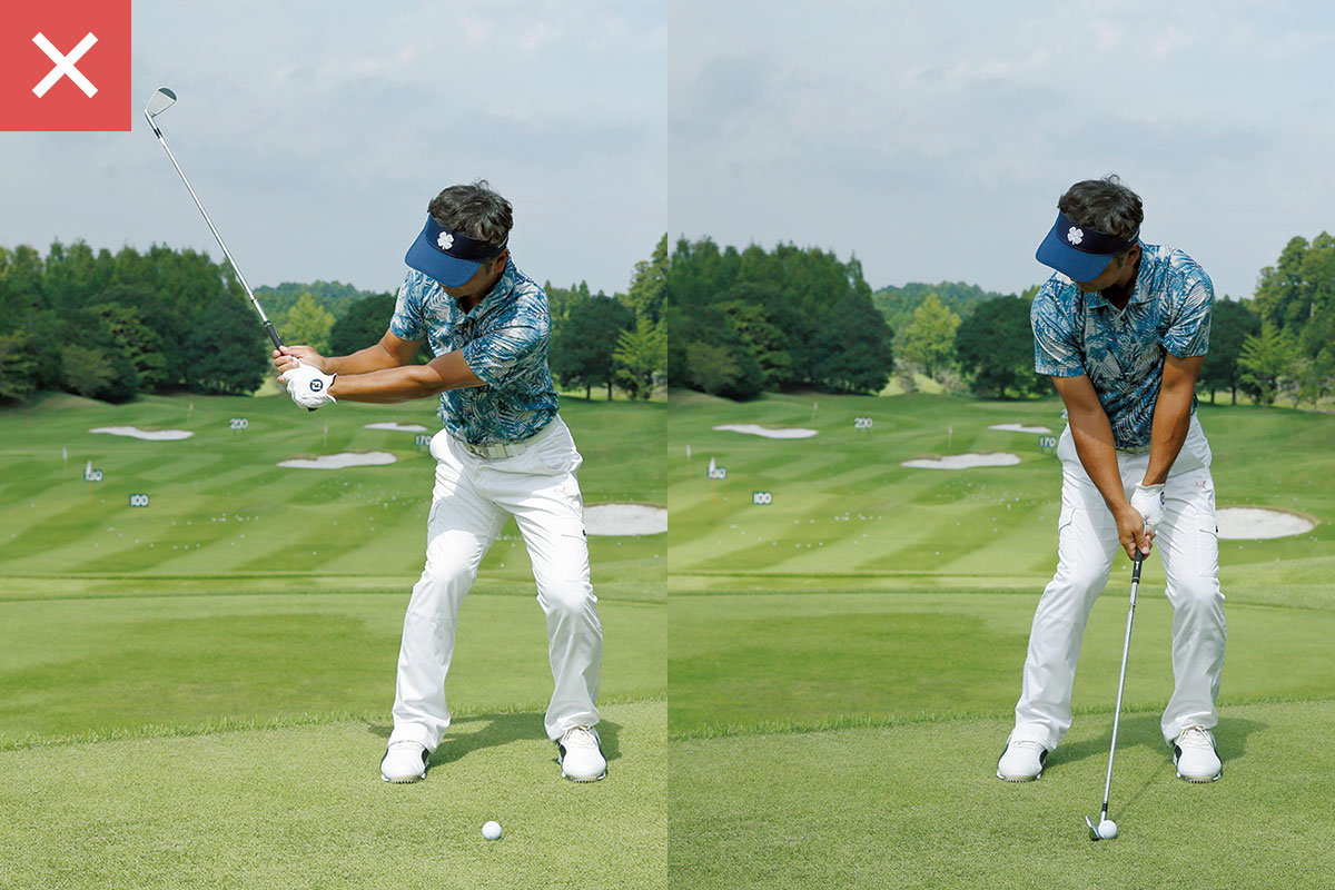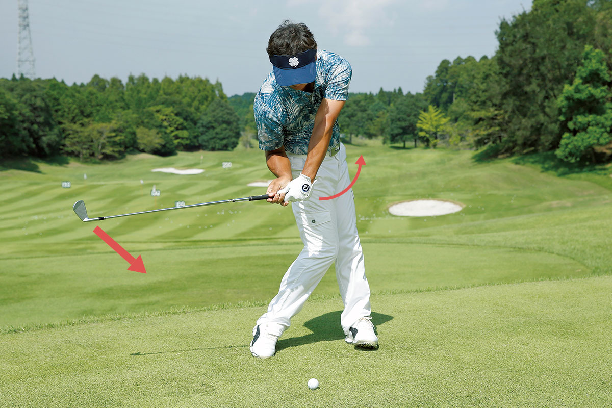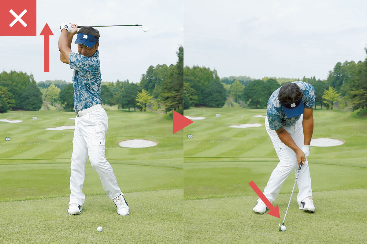ダウンブローは、クラブを鋭角に振り下ろして地面を強く叩くだけではありません。体を回転させずに腕の動きで上から打ち込もうとすると、体の上下動が起こりやすくなります。バックスイングで上体が起き上がり、その反動でダウンスイングでは上体が沈んでフェースの刃が刺さり、インパクトが詰まってしまうのです。