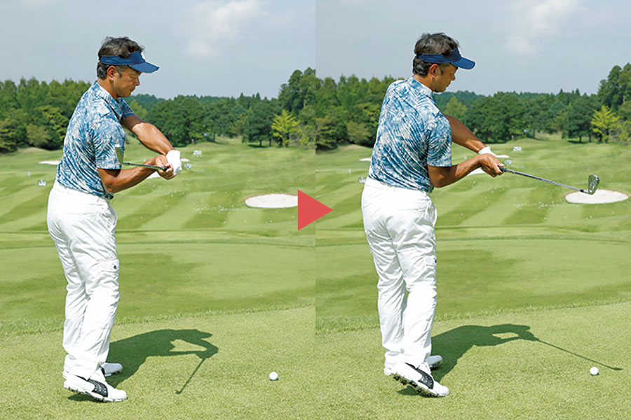 またアウトサイドインのカット軌道もハンドファーストでインパクトするのが難しく、ショットの方向性が安定しません。また、体の真正面でボールをとらえるイメージが強い人の場合は、ダウンブローに打っているつもりでも振り遅れることができません。そのためにハンドファーストの形がつくれていないことがよくあります。このような間違ったダウンブローになっていないか、自分のスイングをチェックしてみてください。