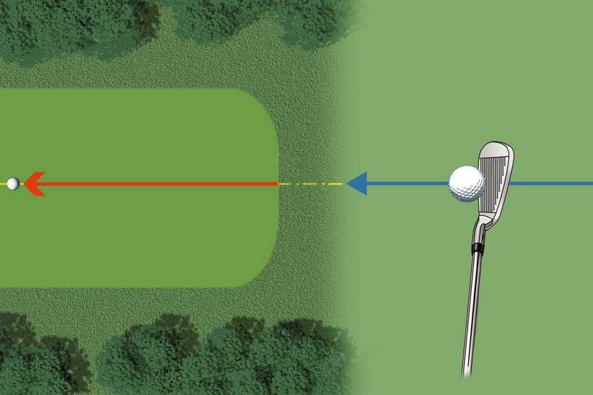 前項で正しいダウンブローに打つとボールが少し右に飛ぶと説明しましたが、ボールに当たる瞬間にフェースをスクエアに戻そうとすると、インサイドアウトのクラブパスに対してフェースが少しクローズになるため、球筋は軽いドローとなります。結局、どちらにしても目標に対してまっすぐは飛ばないわけです。