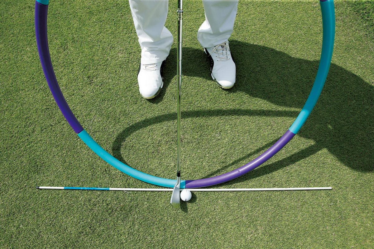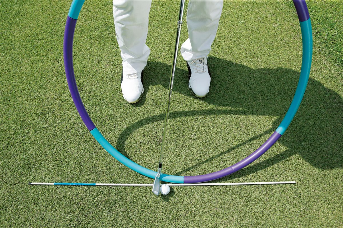 フラフープはスイング軌道を示します。そしてフラフープの青と紫の境目がスイング軌道の最下点です。正しいダウンブローはスイング軌道の最下点の手前でボールをとらえますから、ボールの位置は自分から見て色の境目より少し右側になります。