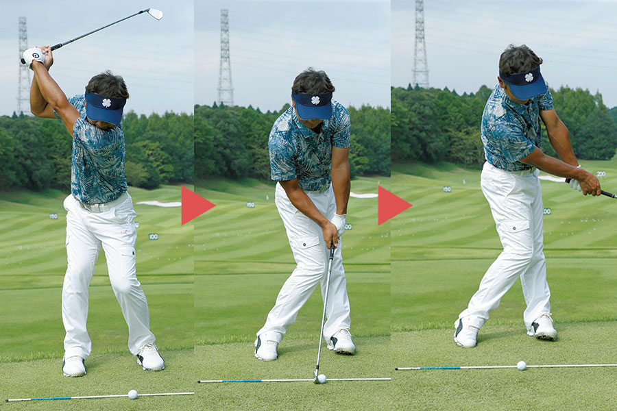 クラブヘッドはスイング軌道の最下点に到達するまではインサイドから下りてきて、最下点を境にしてインサイドへと振り抜かれます。つまり、最下点に達する手前でボールをとらえるダウンブローの軌道は、インサイドアウトになるわけです。